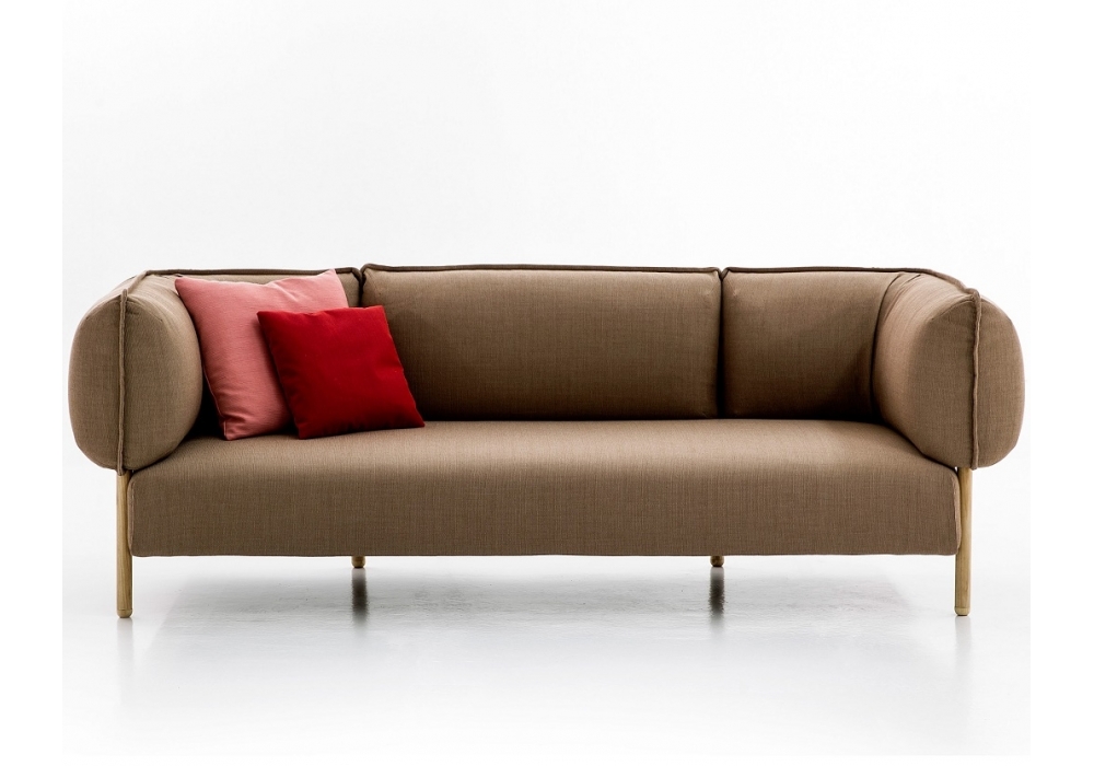 Love (Me) Tender is the sofa designed by Patricia Urquiola for Moroso. Capture the solid’s lightness, all its softness, and transform it into a design project. Patricia Urquiola trusts her intuition and designs a modular system in a new shape and construction. Her technical approach features an aluminium frame, rounded wooden legs, an abundance of cushions, tables and horizontal surfaces. Just a few easily assembled interchangeable parts. The result surprises and deceives the senses. The fullness of the modules is contrasted by the lightness of the platforms that seem capable of defying gravity as imaginary structures on stilts suspended over the floor. The legs that appear to have little to do with the frame are actually the pillars that can be anchored to it and grouped in multiple compositions. The covering in soft wool jersey that stretches in both width and length fits and outlines the forms with the elegant accuracy of the pleating in continuation of the approach first expressed with M.a.s.s.a.s. in 2012.