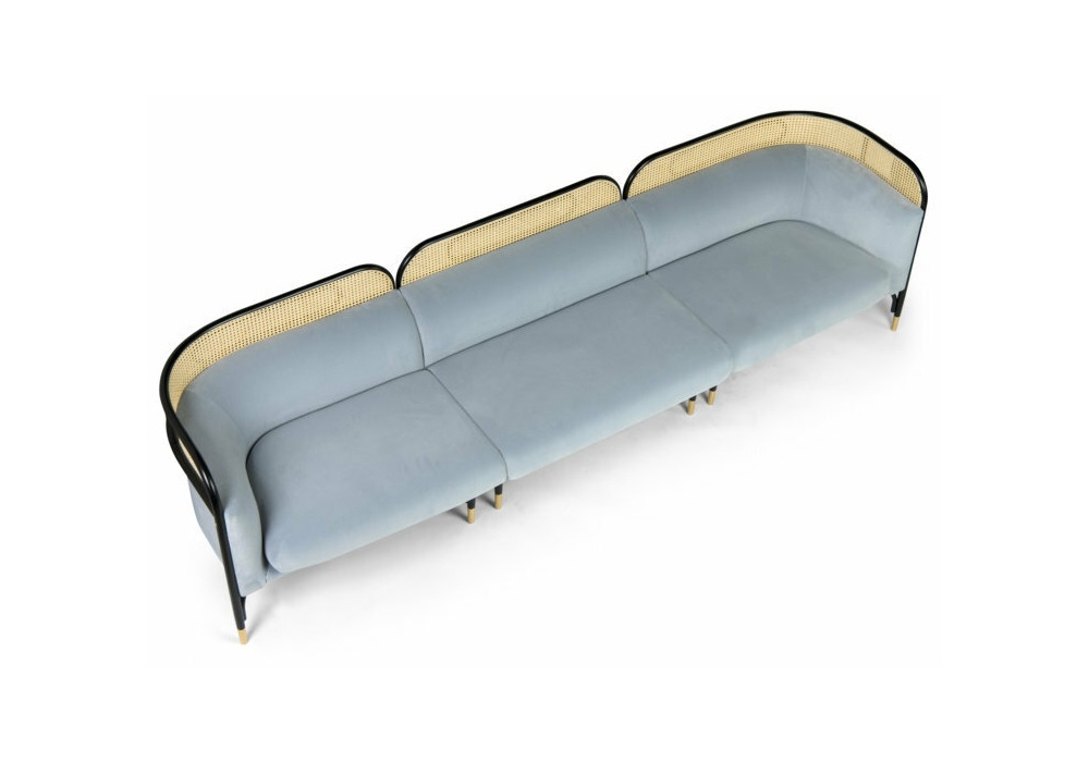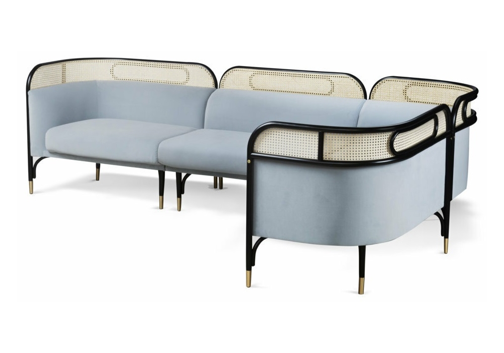 Targa designed by GamFratesi for Gebrüder Thonet Vienna is a modular sofa with bent beech structure available in different finishes, decorative element in Vienna straw. Upholstered seat and back with fabric or leather upholstery. Also available with brass feet.