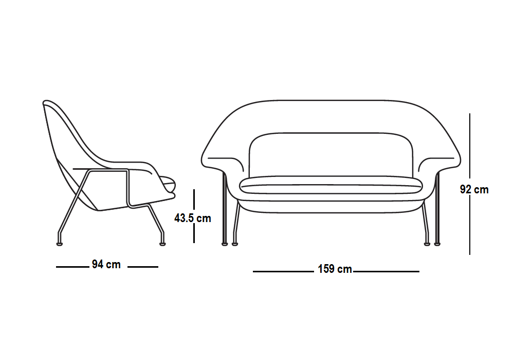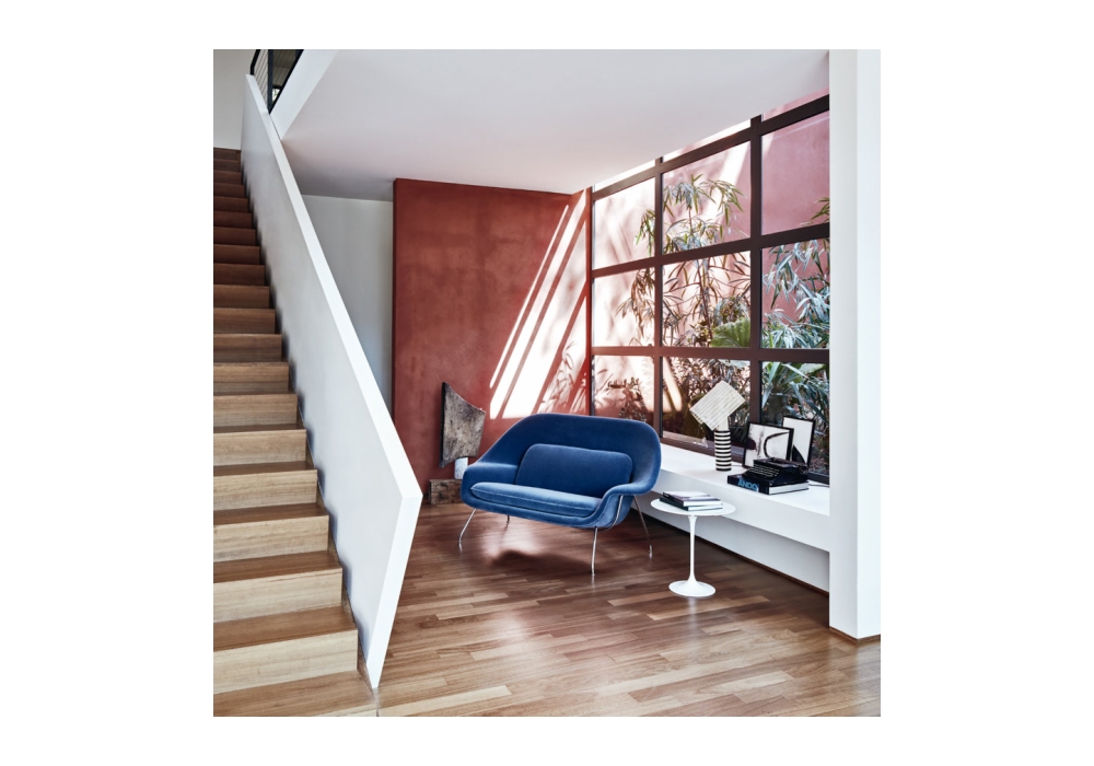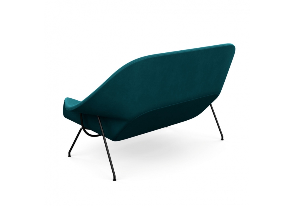 Womb designed by Eero Saarinen for Knoll is a settee with structure in steel rod, polished chrome finish or painted black. The seat can be upholstered in leather or fabric.