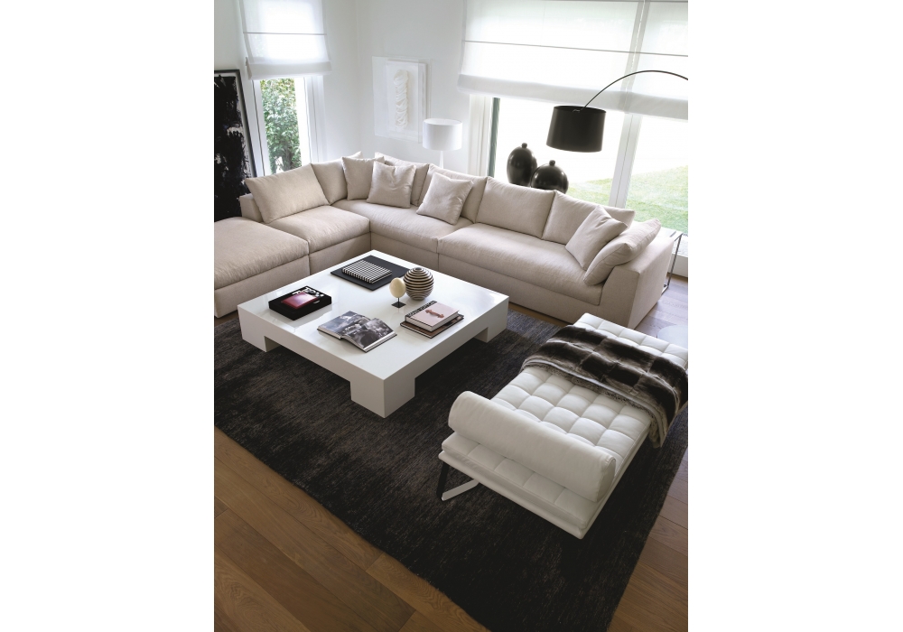 Louis Small designed by Andrea Parisio for Meridiani is a sofa with wooden frame and non-deformable polyurethane padding. Black ABS feet. Upholstery available in fabric or leather. Made of different sizes with possibility of different modular configurations.