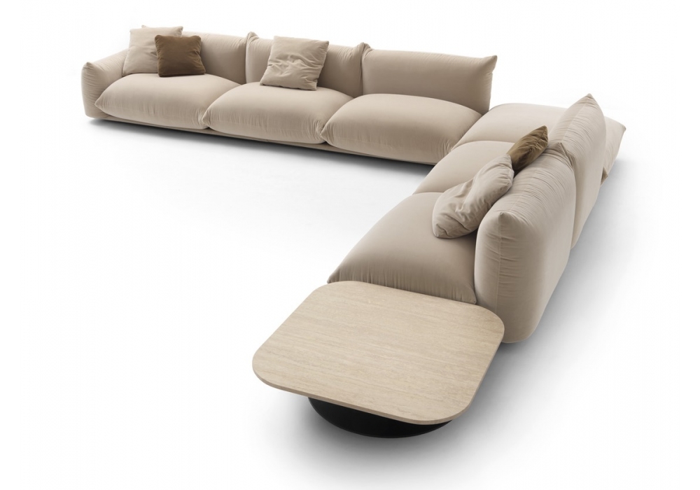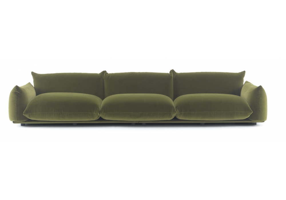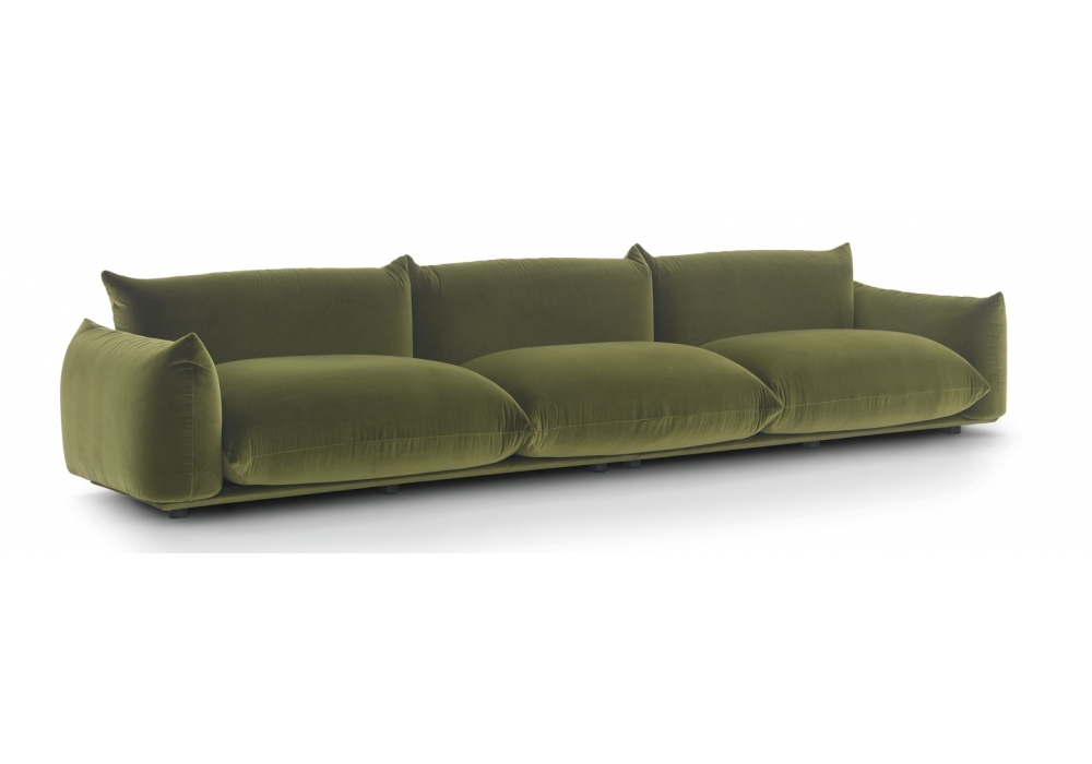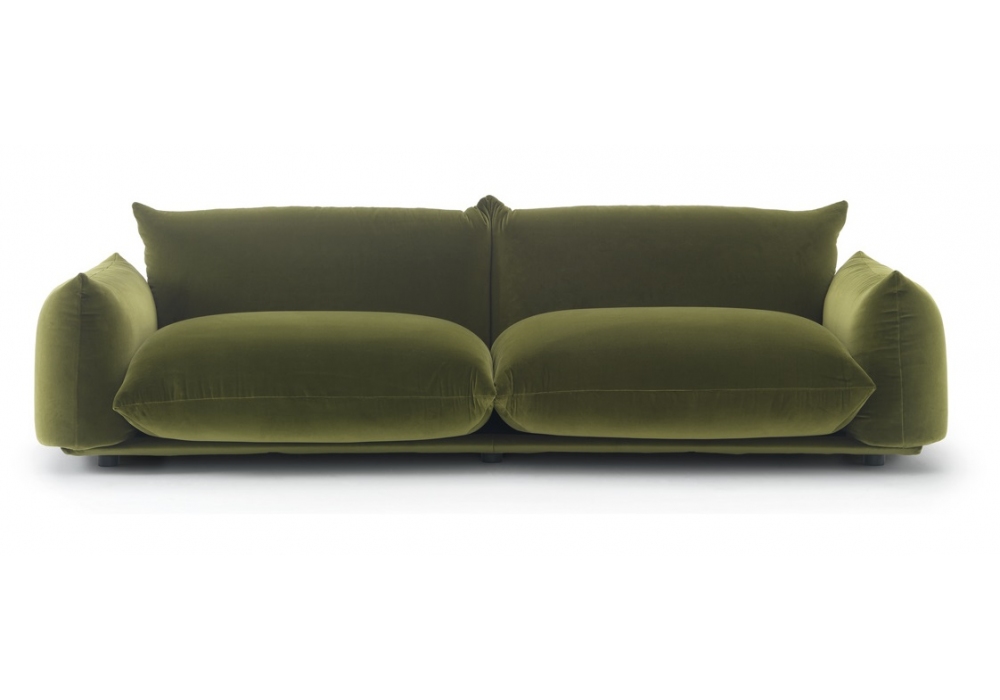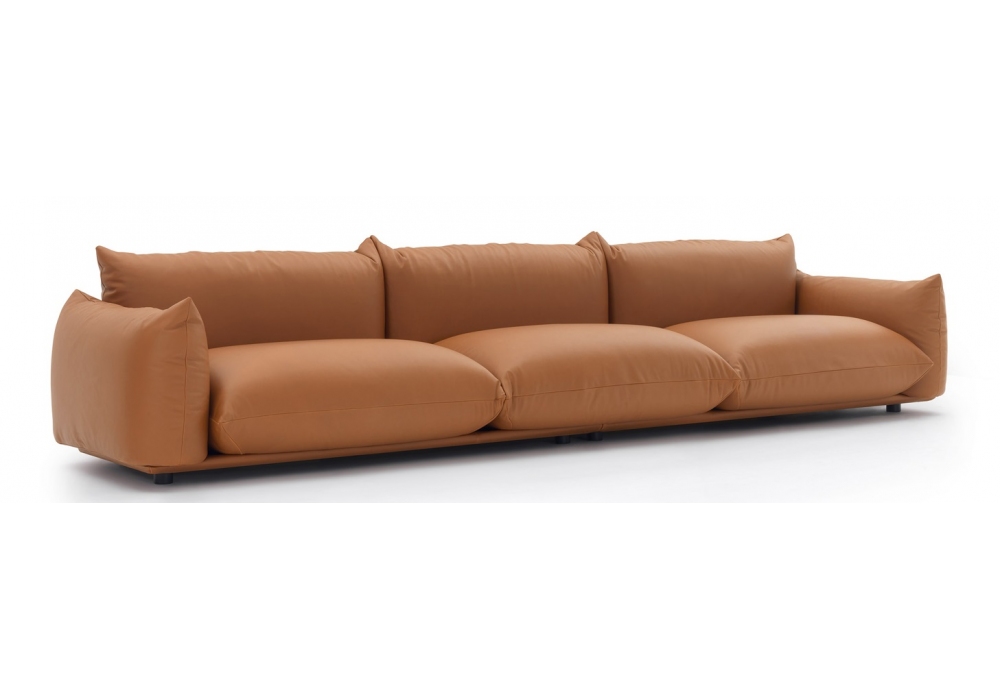 Marenco designed by Mario Marenco for Arflex is a sofa with upholstery in fabric or leather. Black lacquered metal feet and protective nylon glides. Seat cushion, backrest and armrest in shaped polyurethane with differentiated density / polyester slip cover.