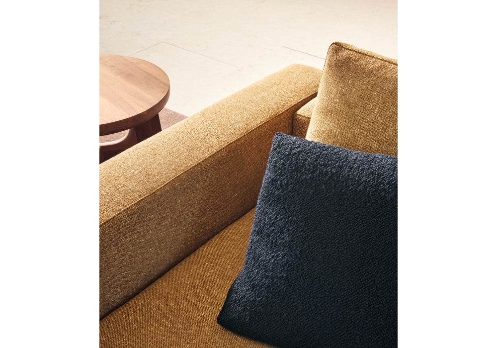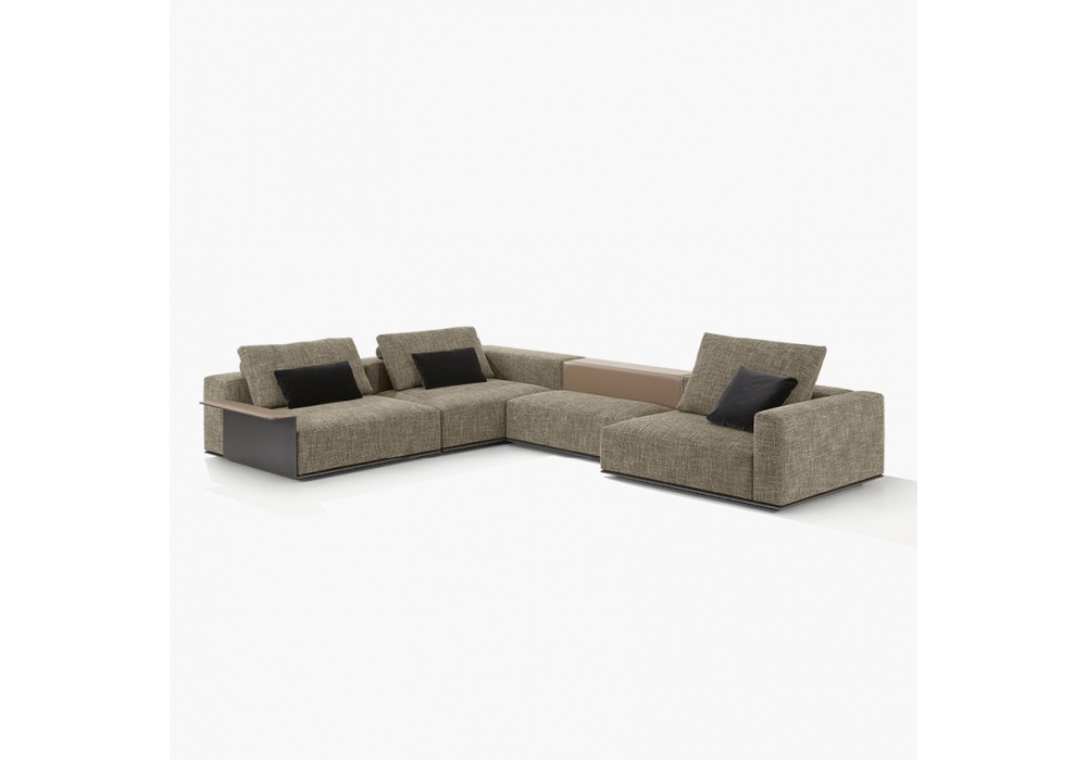 Westside designed by Jean-Marie Massaud for Poliform is a modular sofa with thin wooden base and upholstery available in fabric or leather.