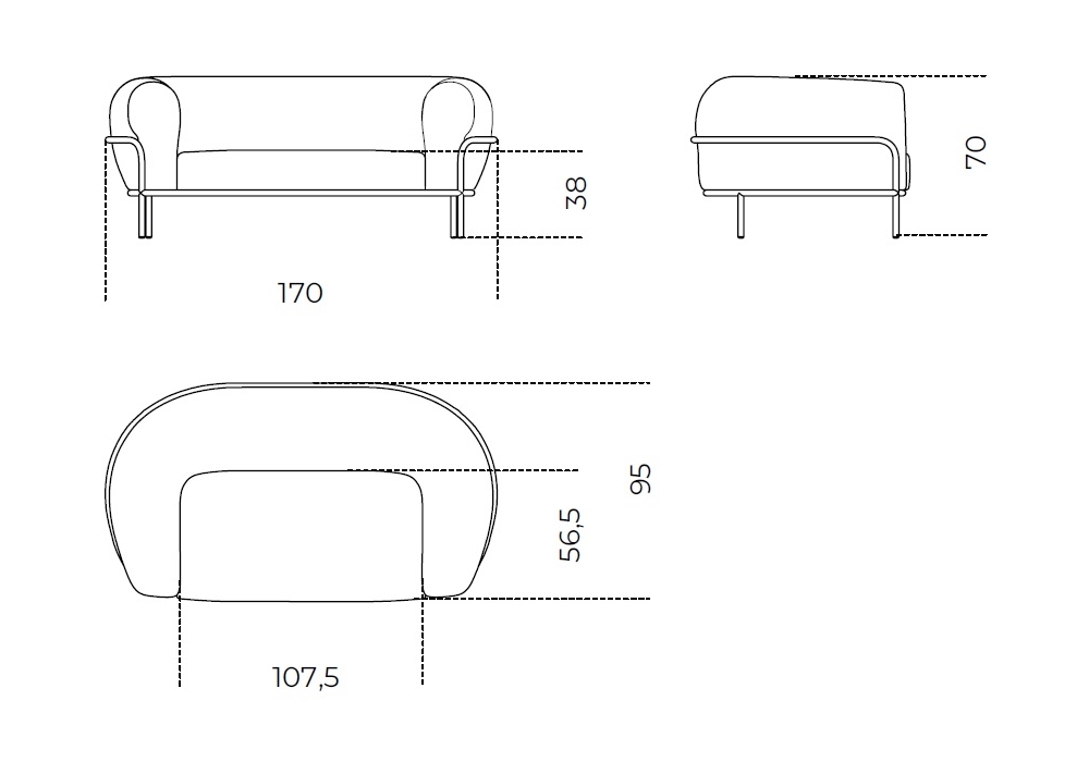 Sophie designed by Federica Biasi for Gallotti&Radice is a settee with foam polyurethane padding. Removable cover in fabric as per samples. Satin brass or anthracite grey lacquered metal structure.