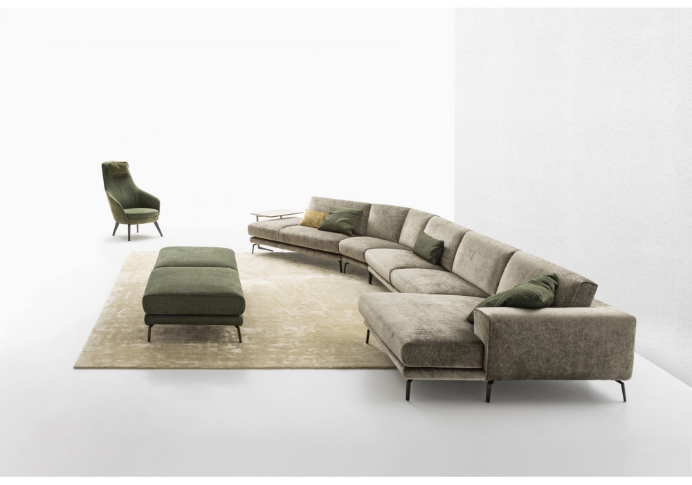 Bora designed by Nicoline is a sofa with structure in wood and plywood, seat springing with elastic straps. Padding in eco-friendly polyurethane foam with different densities, covered with tecnoform. Cover in fabric or leather. Feet in polished, satin-finished metal and gunmetal. Optional elements in marble and wood. Also available with contrast stitching.