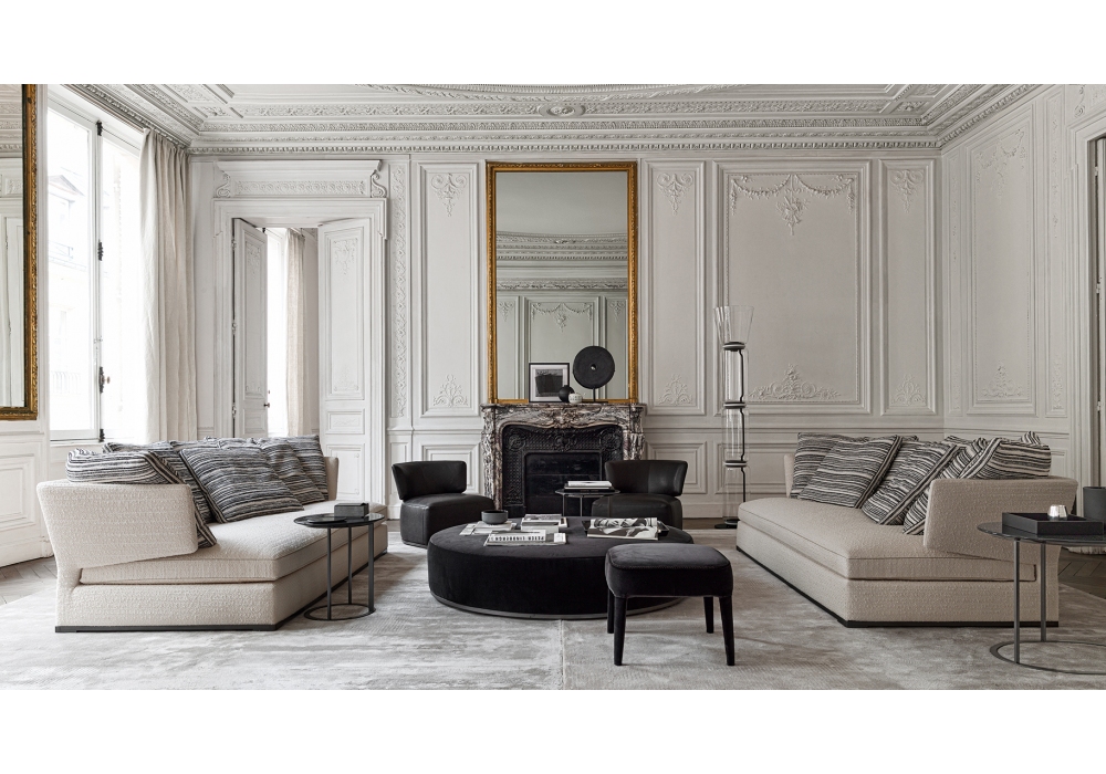 Amoenus Soft designed by Antonio Citterio for Maxalto is a modular sofa with lower edge in painted aluminum in different finishes. Upholstery in fabric or leather. The fabric version product (excluding velvet) has eco-leather profiles; the leather version product has envelope stitching. The version with envelope stitching can only be made tone-on-tone.