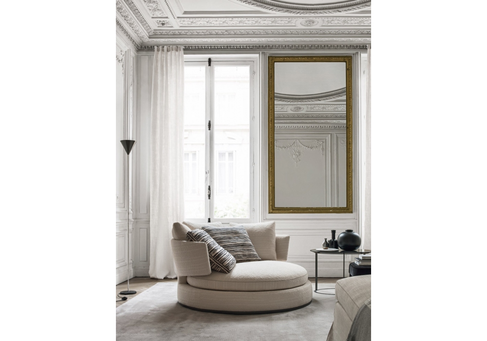 Amoenus Soft designed by Antonio Citterio Maxalto is a swivel sofa made with lower edge in painted aluminum, upholstery in fabric or leather and profiles in eco-leather. Available in different finishes and dimensions.