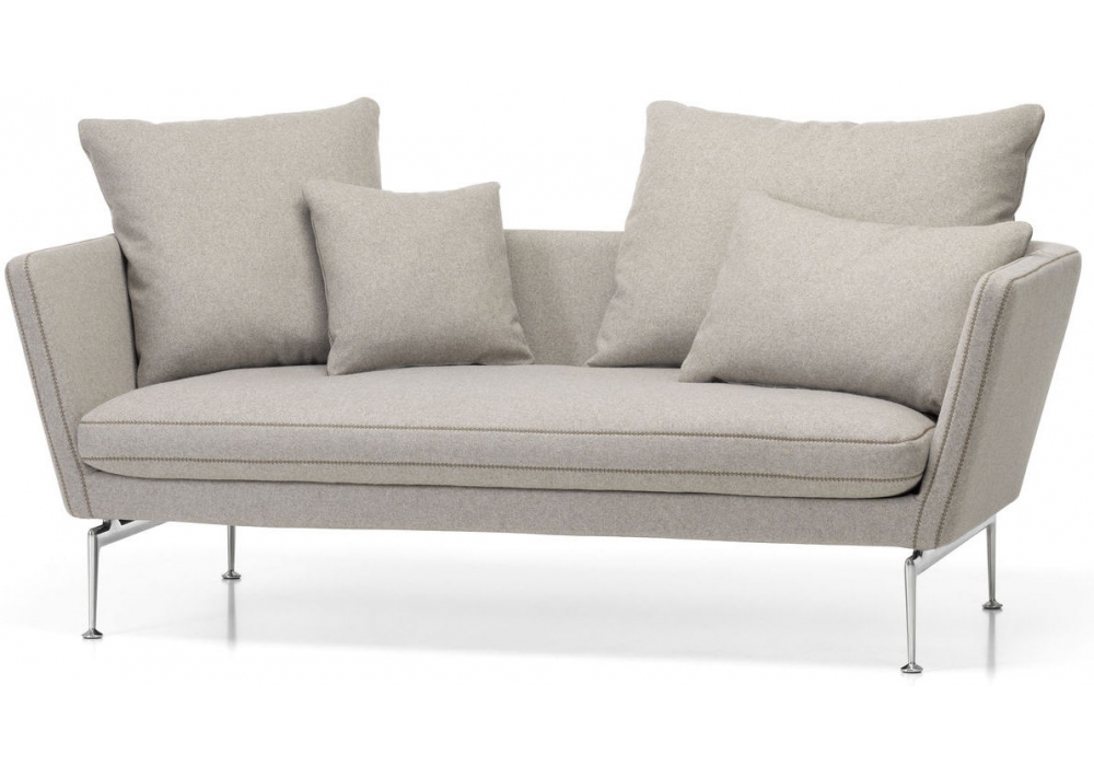 Suita 2 Seater designed by Antonio Citterio for Vitra is a 2-seat sofa available with traditional pillows or with pointed back cushions. Optional the shelf in the back of the backrest and the high headrest. The sofa has a die-cast aluminum base with a glossy or powder-coated finish, the structure is covered in removable fabric or leather.
