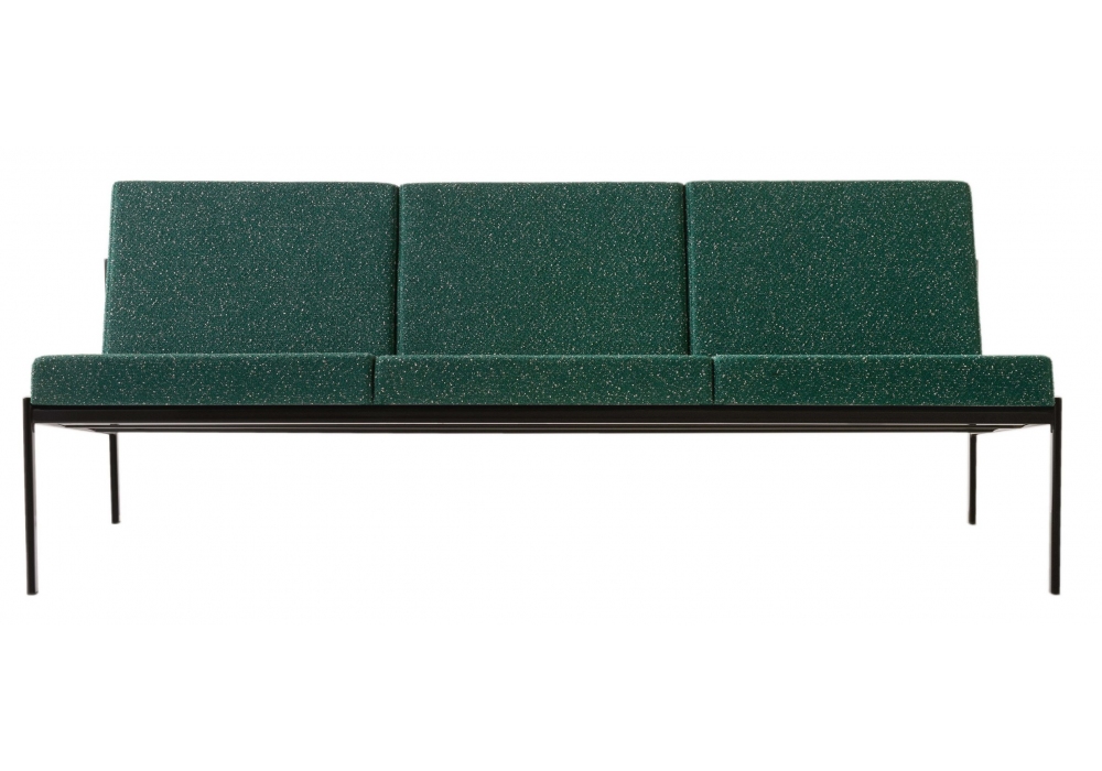 Kiki designed by Ilmari Tapiovaara for Artek is a sofa made with black gloss powder coated frame and fabric or leather upholstery. Available in 2 dimensions.