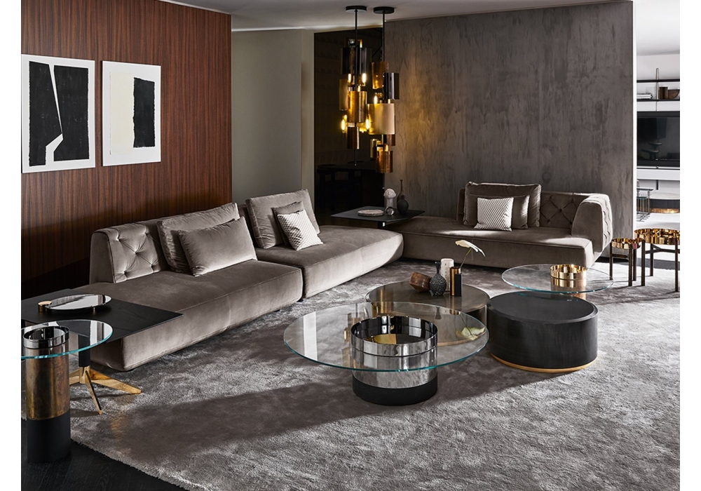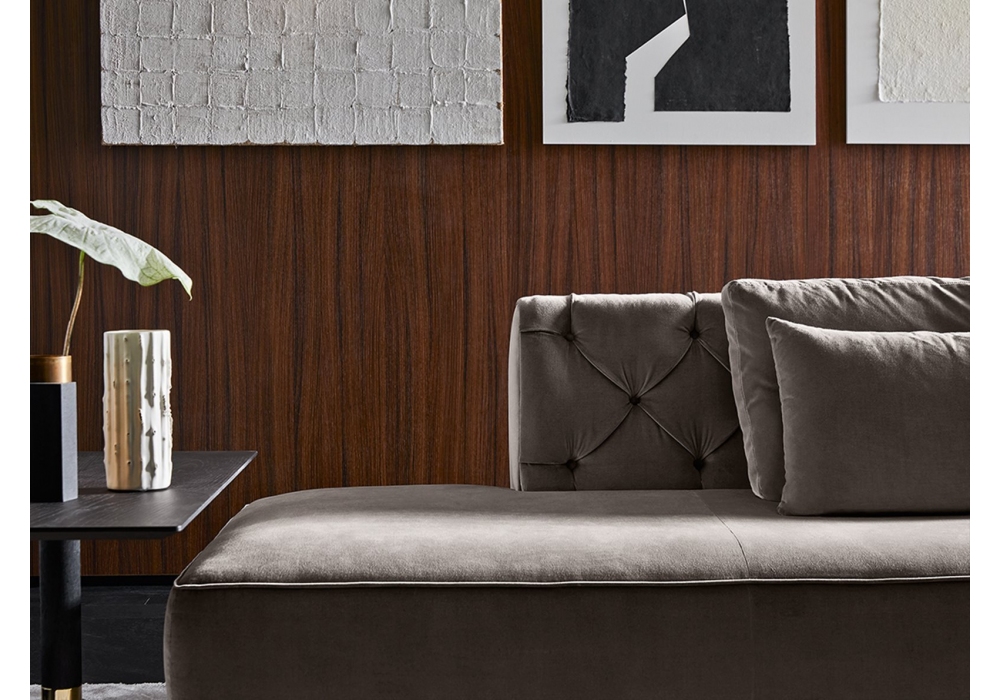 Fiona designed by Massimo Castagna for Gallotti&Radice is a modular sofa in non-deformable foam polyurethane in different density and polyester fibre with wooden inside structure. Black lacquered wooden feet. Capitonné back. Mixed down padding backrest cushions. Available covered by fabric or leather as per sample. Decorative polyester fibre cushions, on request.
