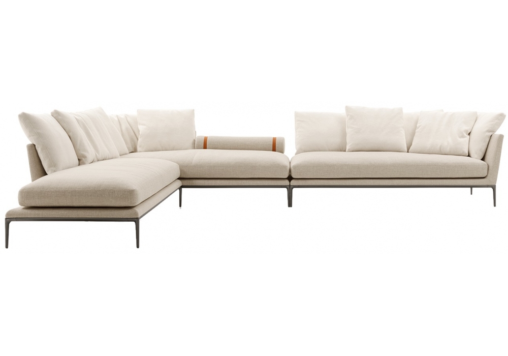 Atoll Soft designed by Antonio Citterio for B&B Italia is a modular sofa with softer shapes and cushions than the classic version. Aluminum structure in polished brushed finish, black chrome or pewter varnished. Upholstery available in fabric or leather.