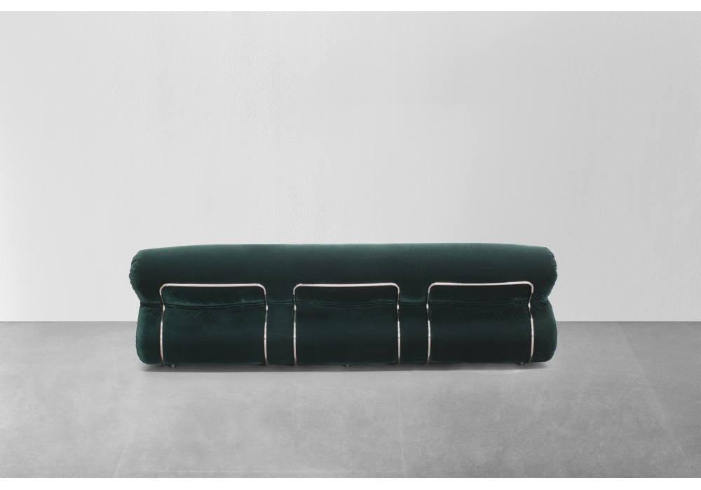 Orsola designed by Gastone Rinaldi for Tacchini is an upholstered sofa with rounded chromed metal structure. The upholstery is handmade by master upholsterers.