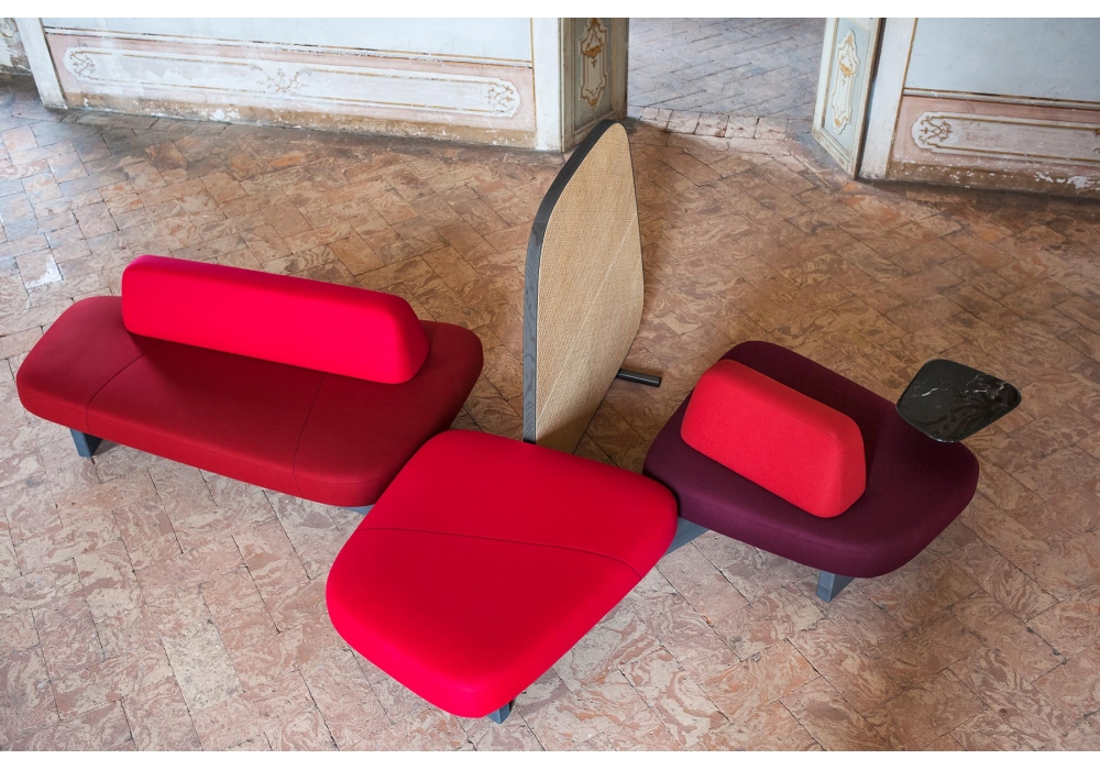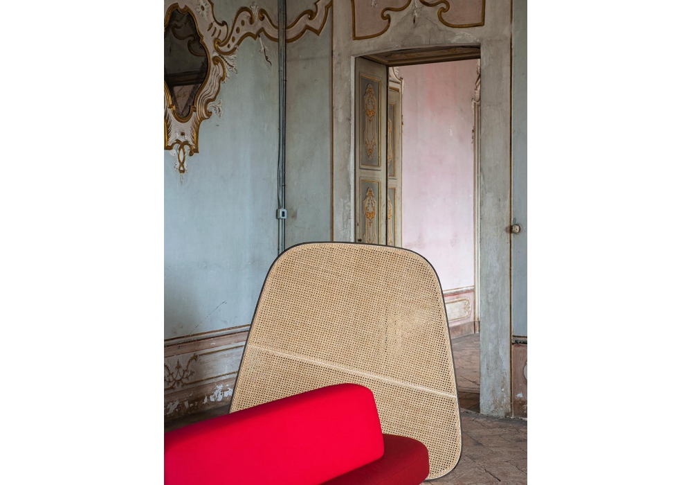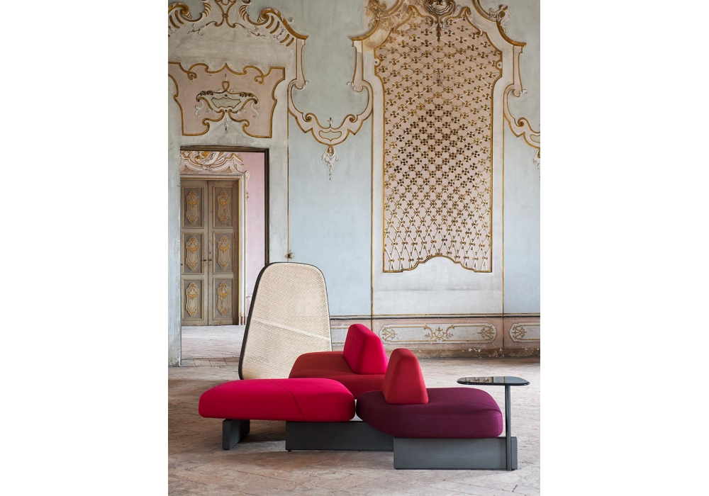 Ischia designed by Pearson Lloyd for Tacchini is a modular system with internal structure in poplar plywood with elastic belts, which allows you to create various seating solutions. The base is in open pore dyed ash, with marble feet. It is possible to add accessories such as the Nero Marquinia marble coffee table and the Vienna straw screen with frame available in two colors. The upholstery and blanket stitching of the different elements are available in different colors.