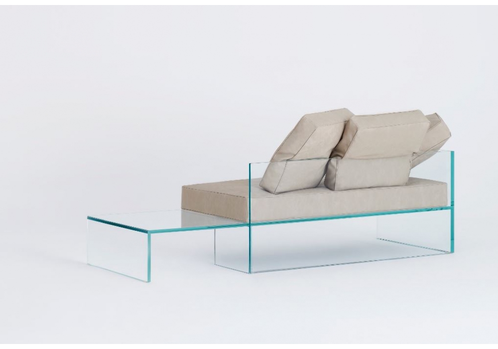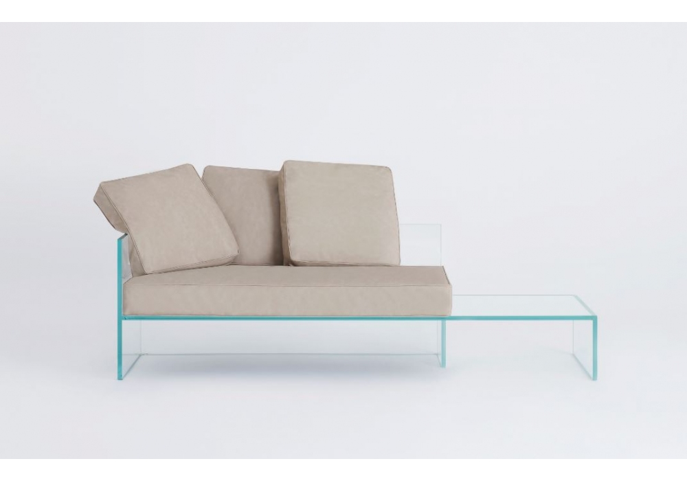 Tête-à-Tête designed by Piero Lissoni for Glas Italia is a sofa with structure in transparent extralight mm 19 shaped, tempered and assembled with UV gluing. The structure is covered with soft cushions, removable and available in various fabrics or eco-leather. different colors. The padding is made of hypoallergenic, cruelty free and eco-friendly material, obtained by recycling plastics collected from the oceans. Two versions are available: one with a side table integrated into the seat (right or left), the other with double opposed seat.