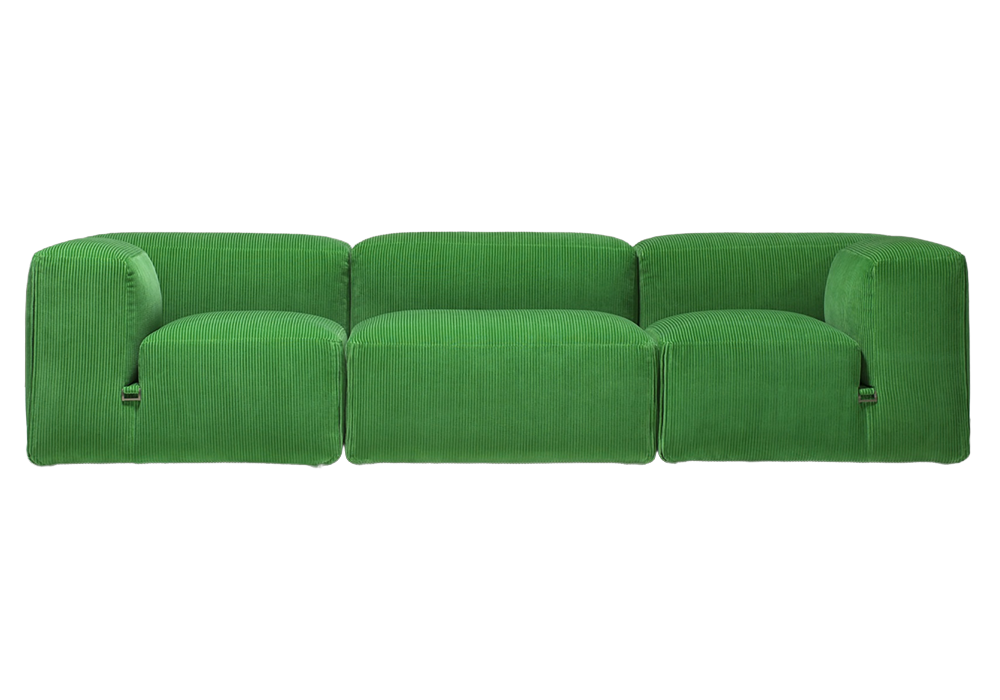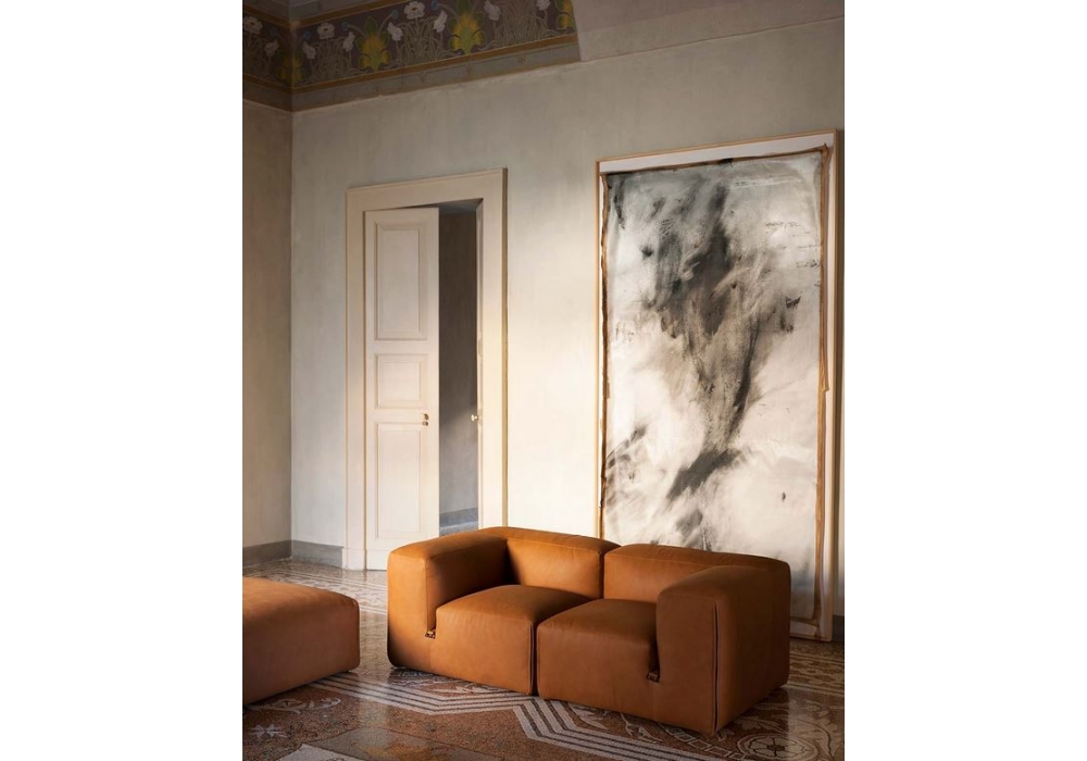 Le Mura designed by Mario Bellini is a modular sofa with removable cover, available in different fabrics and finishes. Metal buckles and hinges, in various colors.