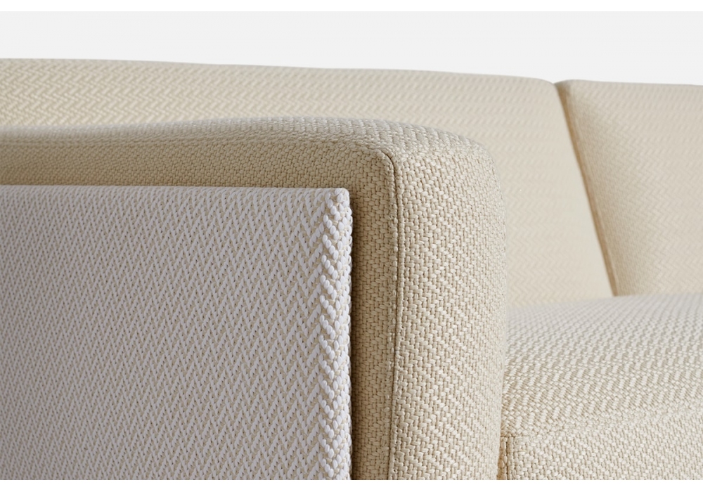 Etiquette Outdoor designed by Gam Fratesi for DePadova is an outdoor sofa with structure in black stainless steel, backrest in solid natural teak treated with oil and adjustable feet in matt black painted metal. The seat and back cushions are made with a removable cover with outdoor fabric in different finishes.