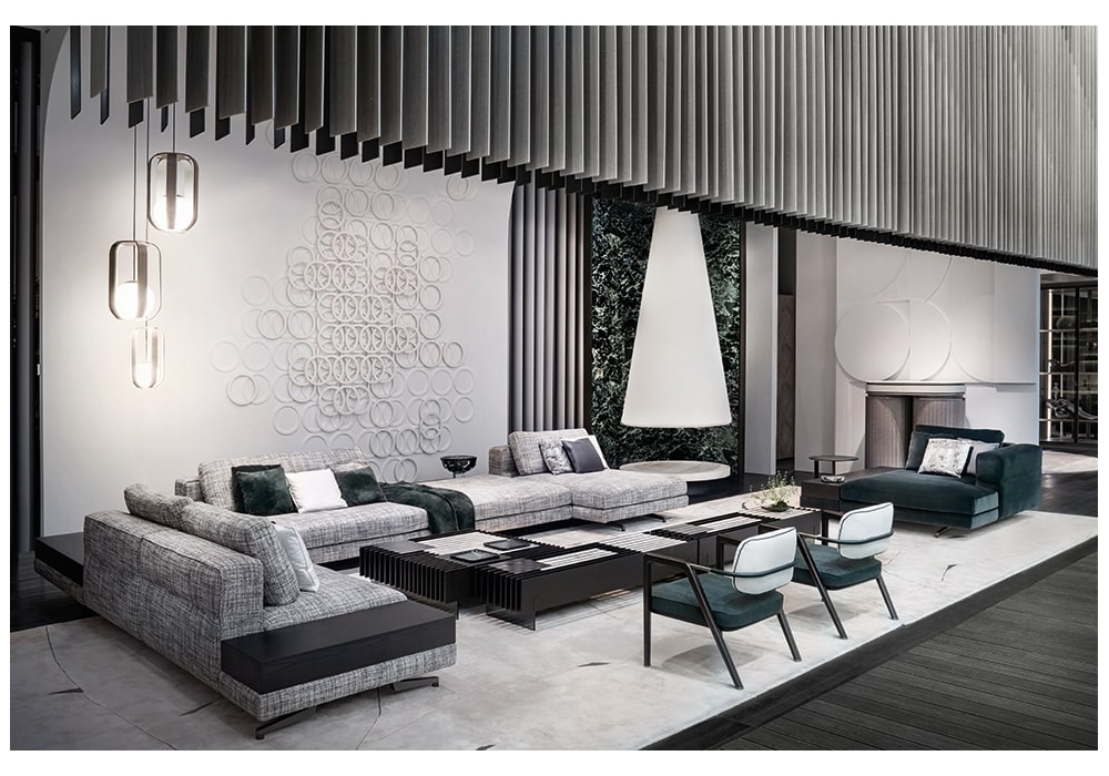 Soho designed by Carlo Colombo for Giorgetti is a modular sofa, which can be made in different compositions. The internal structure of the armrests and backrests is in plywood, the external one in multi-density polyurethane foam and polyester fiber. The structure of the base is made up of a tubular iron covered with polyurethane foam and polyester fiber. The seat cushions are in polyurethane foam and covered in polyester fiber. The feet are in pewter finish painted metal with a solid pau ferro terminal. The removable cover is available in fabric or leather. The integrated tables, where present, are available in different materials and finishes.