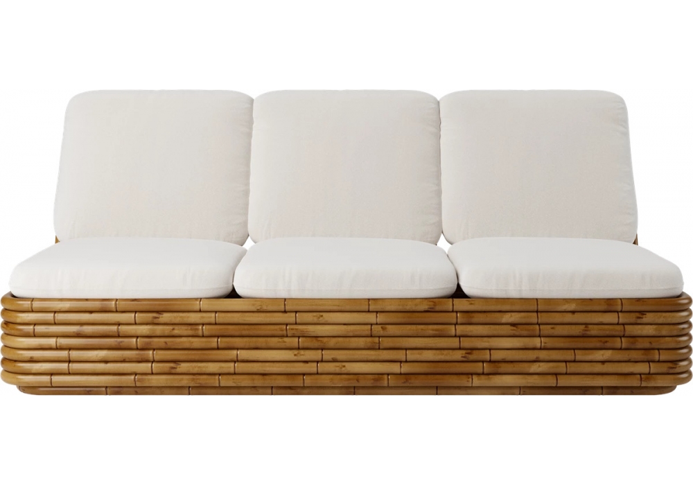 Bohemian 72 designed by Gabriella Crespi for Gubi is a sofa with rattan base and fabric upholstery.