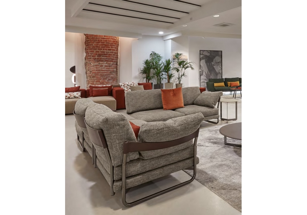 Alef designed by Archirivolto for Dema is a sofa made with internal structure in solid fir, seat cushions in polyurethane foam in different densities, with quilt in channeled goose down. Feet in metal painted RAL 8022. Upholstery in fabric and leather.