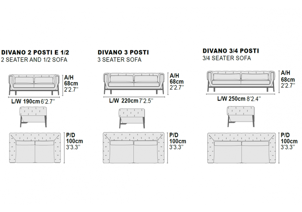 | Dimensions | - 190 x 100 x H 68 cm; - 220 x 100 x H 68 cm; - 250 x 100 x H 68 cm. |