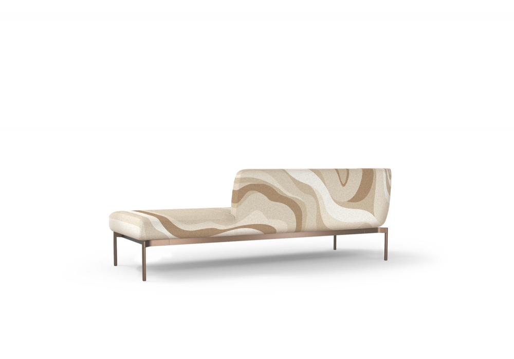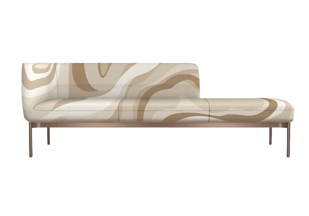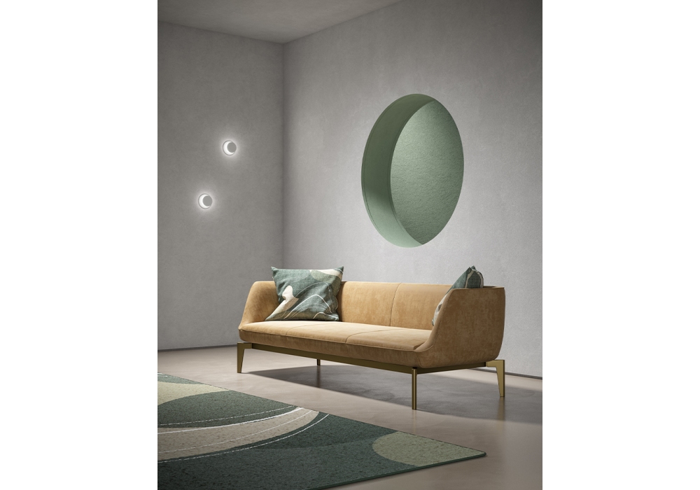 Fauno designed by Studio Debonademeo for Momenti is a sofa with iron frame structure with plywood floor, monobloc padding in polyurethane foam covered in polyester fiber. Feet in white, black, bronze and brass painted metal. Cover in different finishes, not removable. Available in different sizes.