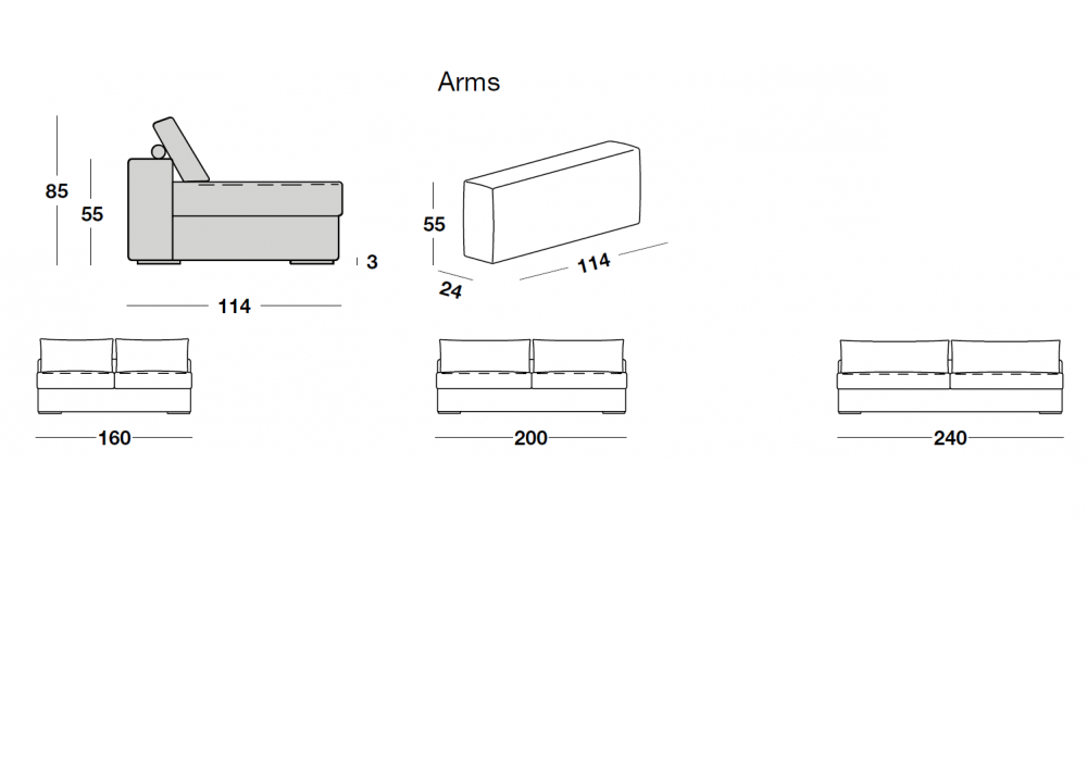 | Dimensions | - 160 x 114 x H 85 cm; - 200 x 114 x H 85 cm; - 240 x 114 x H 85 cm. |