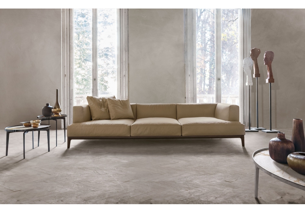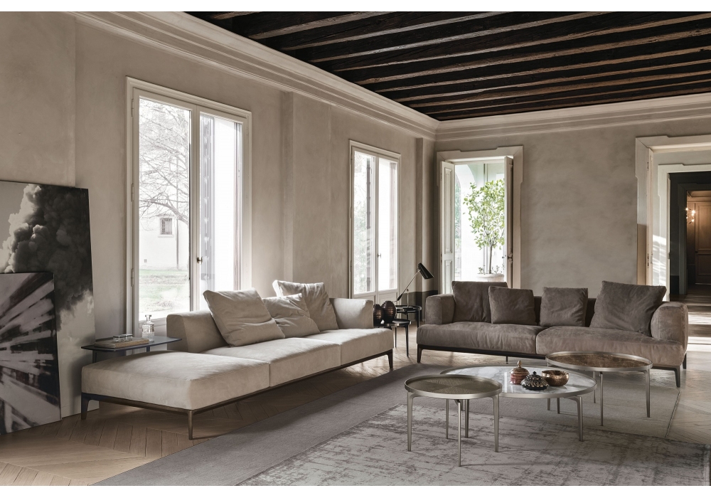 Swing designed by Giuseppe Bavuso for Alivar is a linear or modular sofa made with base in solid painted ash or solid national walnut with internal steel frame. Wooden frame covered in polyurethane foam and sterilized feather quilt. Seat cushion in differentiated density polyurethane foam and sterilized down quilt. Upholstery in fabric or leather.