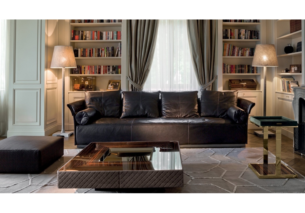 Charme designed by Giuseppe Viganò for Longhi is a modular sofa with base in bronze or black painted metal and structure in polyurethane foam with leather upholstery. Matching buttons or Swarovsky. Available in different compositions.