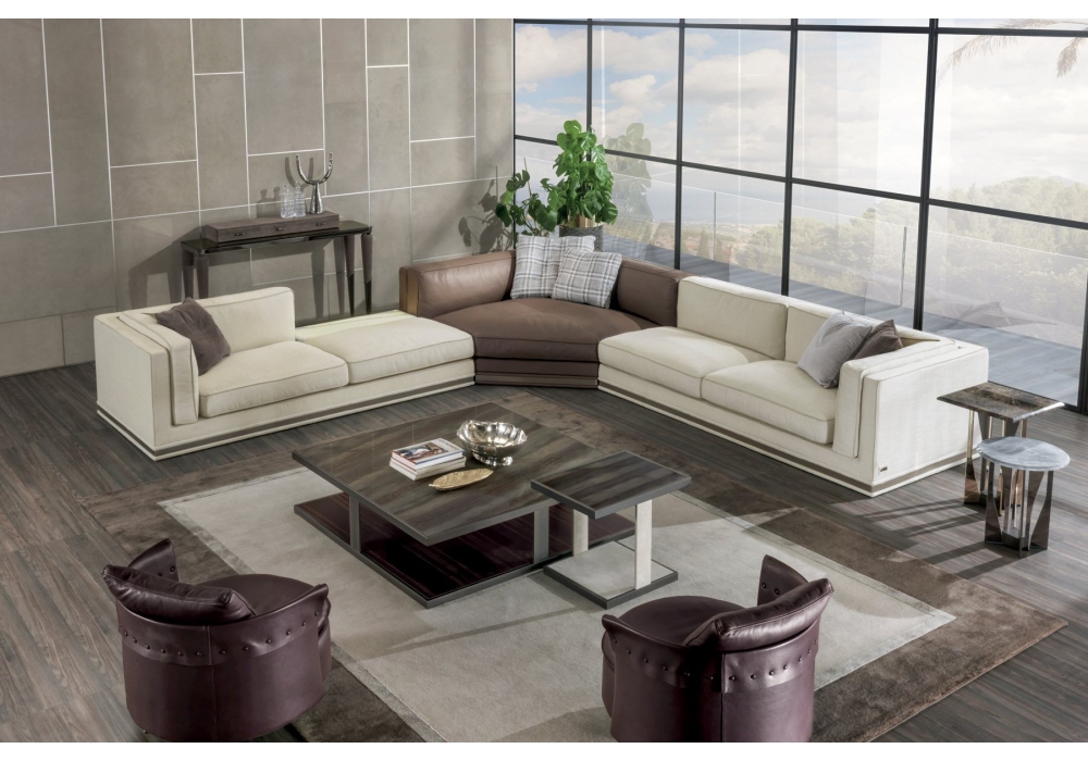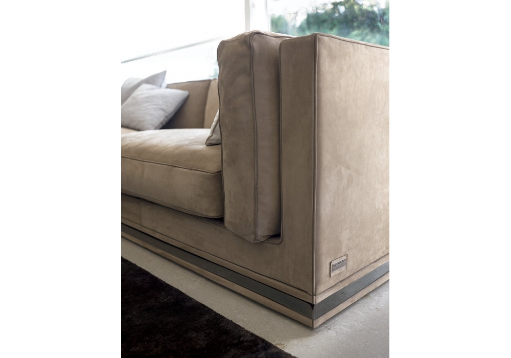 Mason designed by Giuseppe ViganĂ² for Longhi is a modular sofa with wooden structure with elastic straps, covered in high density polyurethane foam. The backrest and armrest cushions are in sterilized goose down, with insert in medium-density polyurethane foam, while the seat cushions are in triple-density polyurethane foam covered in sterilized goose down and supported by Memory padding Foam. Upholstery in fabric or leather and base with chromed metal inserts. On request, it is possible to add a terminal element with a padded service top, in dimmable backlit marble or onyx. Available in different compositions.