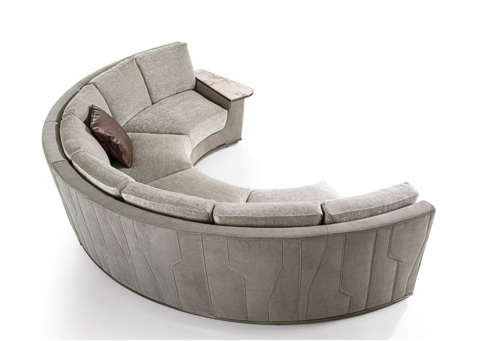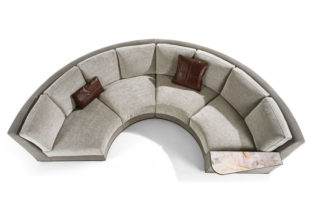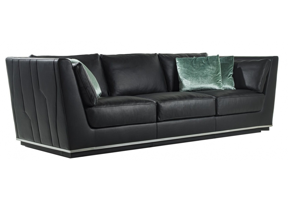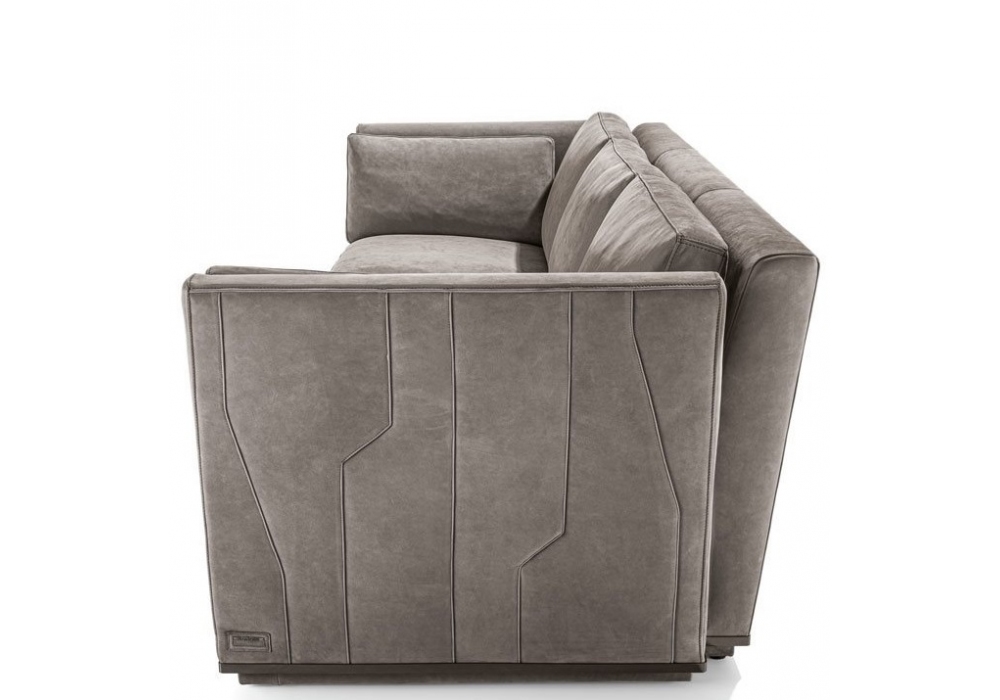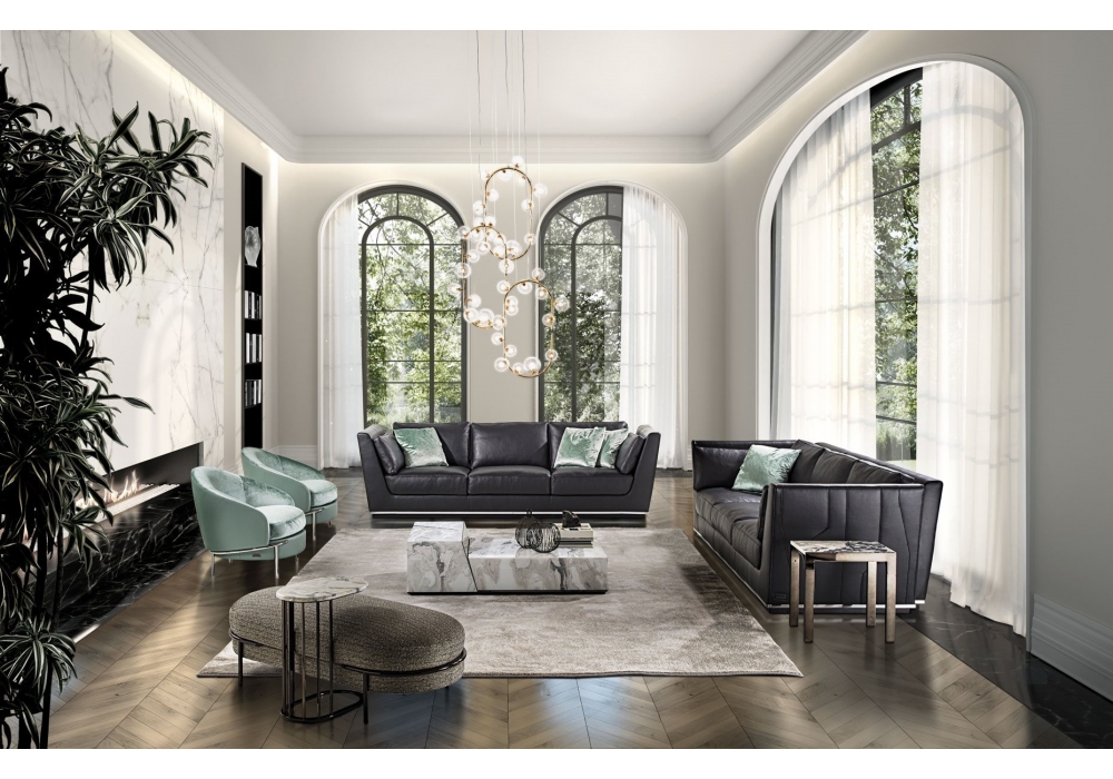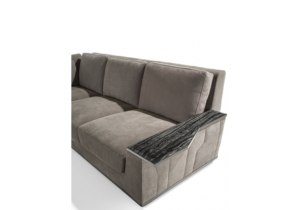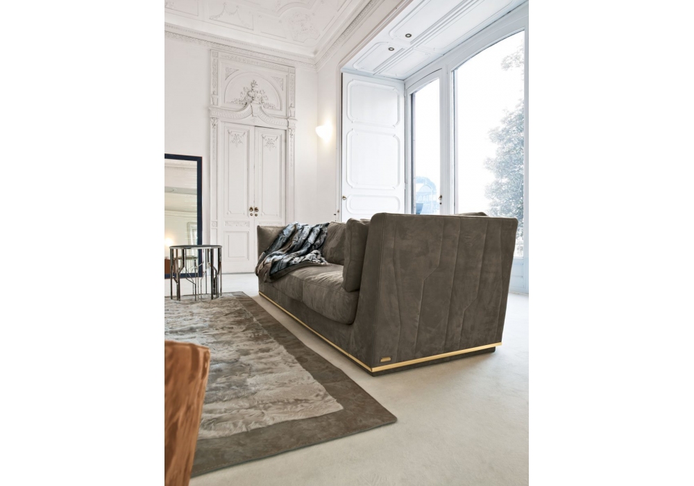 Nobu designed by Giuseppe Iasparra for Longhi is a modular sofa with cover made of non-removable fabric or leather with quilting on the external body. In the base there are metal inserts in a glossy or matt finish. Upon request, the armrests can be made in metal, marble or mirror. Also available in reduced depth (95 cm).