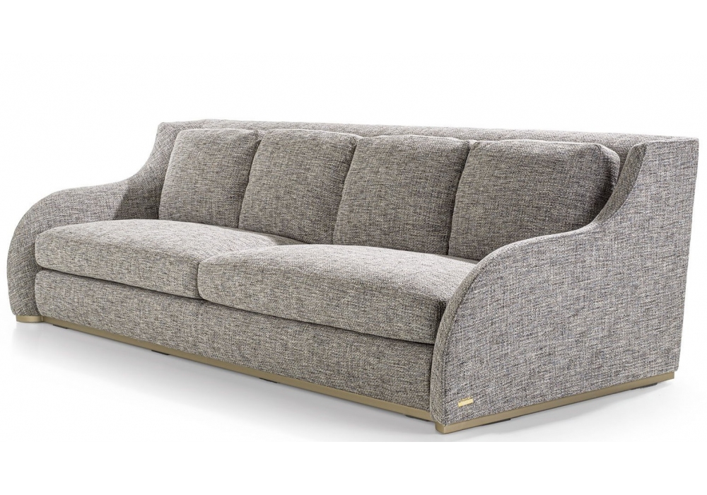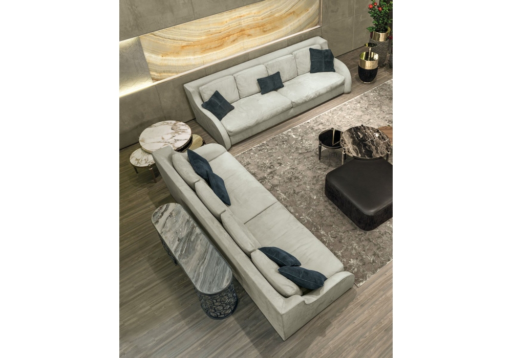 Rey designed by Giuseppe Iasparra for Longhi is a modular sofa with wooden structure with elastic straps, covered in high density polyurethane foam. Back cushions in sterilized goose down, with insert in medium-density polyurethane foam and seat cushions in triple-density polyurethane foam covered in sterilized goose down and supported by Memory Foam padding. Base in chromed metal and upholstery in fabric or leather. On request it is possible to add a dividing table.