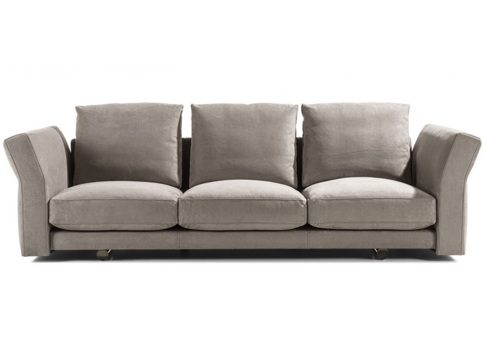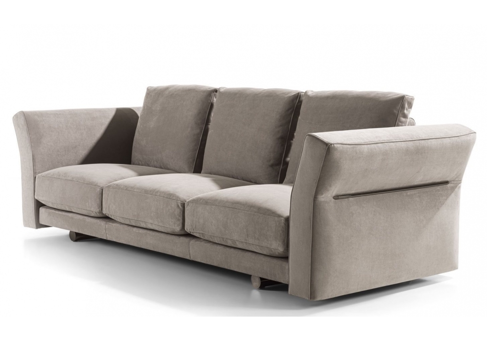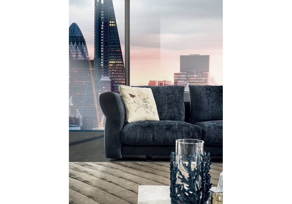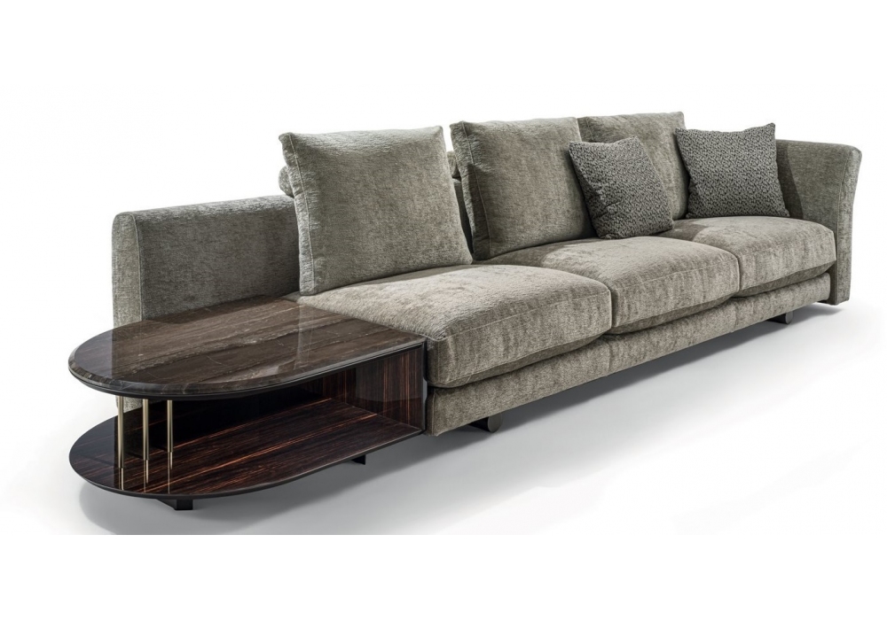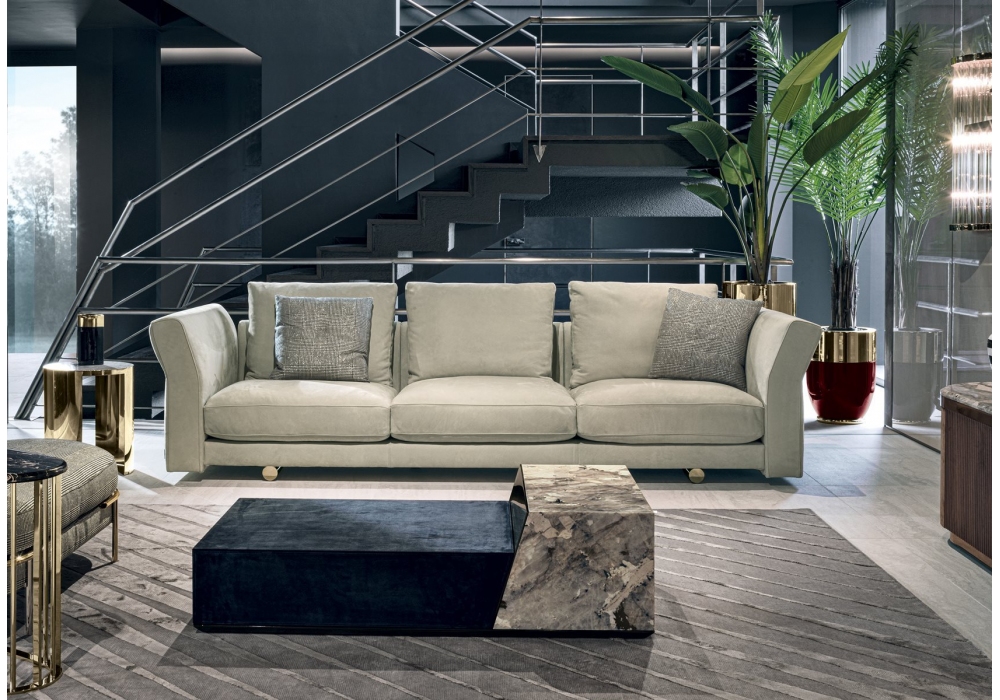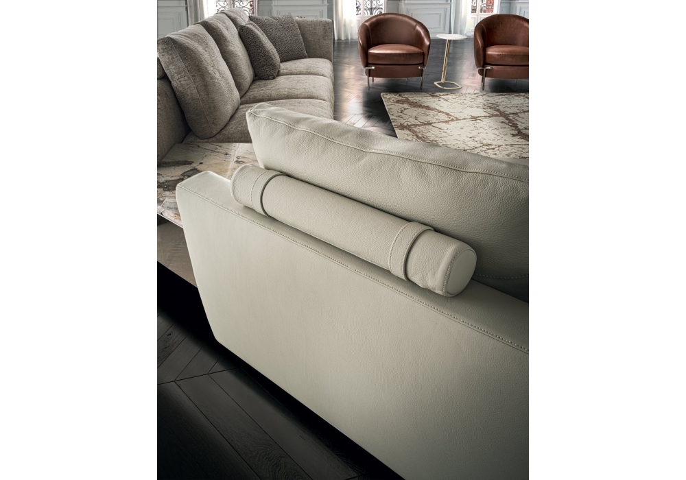 Riverside designed by Giuseppe Iasparra for Longhi is a modular sofa with wooden structure with high resistance elastic straps, covered in high density polyurethane foam. Seat cushions in polyurethane foam of different densities with a final convexity in Memory Foam, and wrapped in sterilized goose down. Back cushions in sterilized goose down, supported by a high density polyurethane foam roller. Upon request, the “Marlène” embroidery can be made on the roller covered in leather. Metal parts (feet, arm inserts) in glossy or matt finish. On request it is possible to add a service table.
