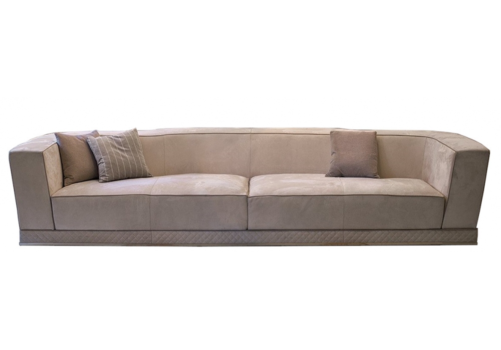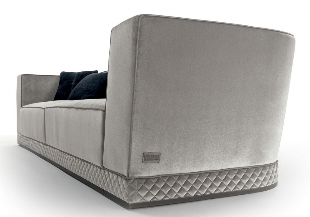 Welles designed by Giuseppe ViganĂ² for Longhi is a modular sofa with lower edge in glossy or matt chromed metal with base with plain or diamond quilted upholstery. Structure covered in leather or fabric. Available in different compositions.