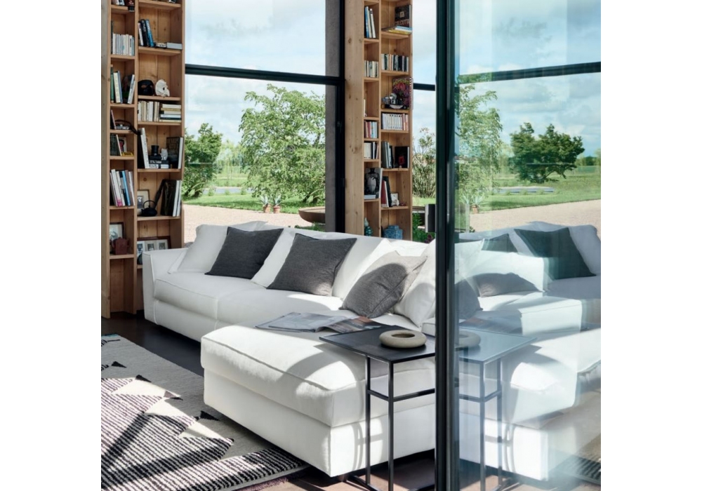 Newport designed and produced by Twils is a sofa with completely removable covers, with goose down padding and internal structure in solid poplar and fir wood. The upholstery is available in different fabrics and colours, the feet are in black ABS (H 4 cm). Available in various compositions.