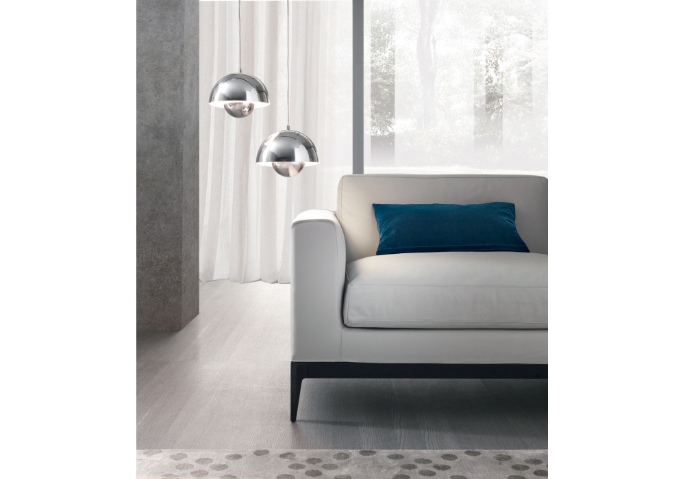 Antibes designed by Ferruccio Laviani for MisuraEmme is a collection of sofas made up of 3 fixed sofas, 6 end and corner sofas and 1 chaise longue to be able to form multiple linear or corner compositions. Sofa base in solid oak, structure in wood and plywood with elastic belts covered in polyurethane foam, dracon fiber and velveteen. Cushions in multi-density polyurethane foam and feather mattress. Upholstery in fabric and leather.