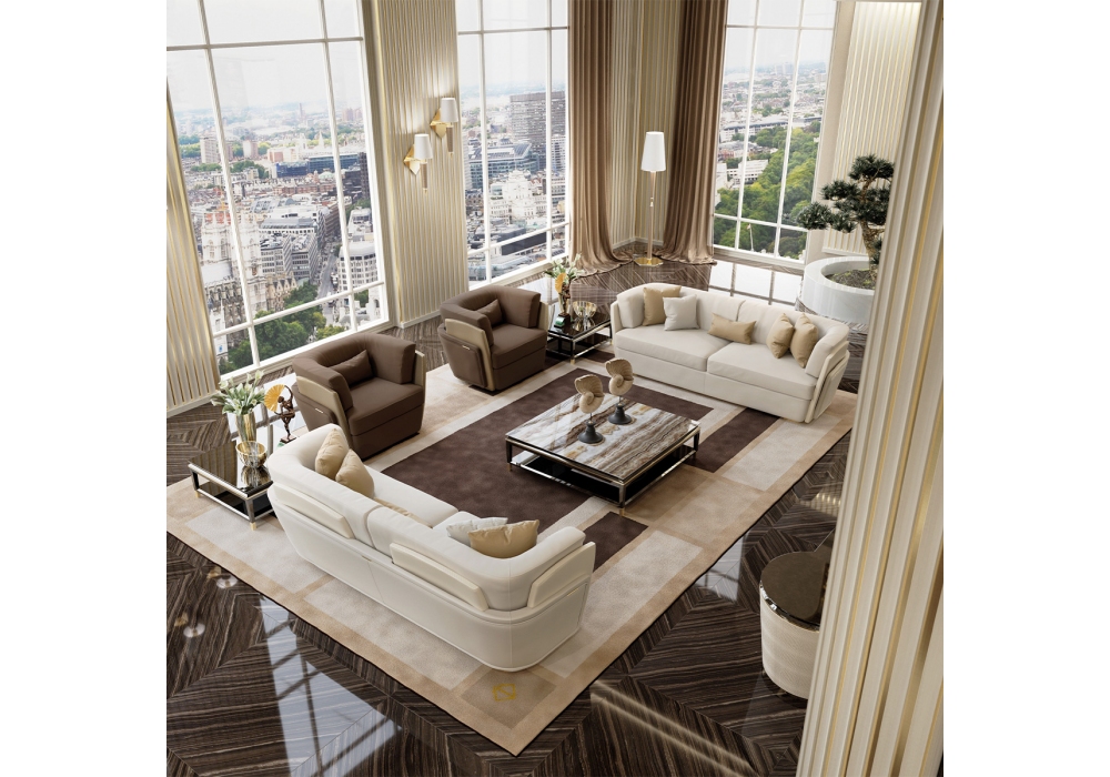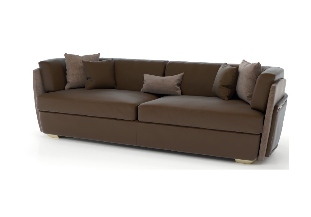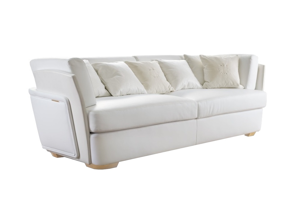 Blanche designed by Andrea Bonini for Turri is a sofa with plywood and solid wood structure padded with multi-density polyurethane foam and covering in different fabrics or leathers. Feet and details in metal in a light gold finish. Available in different diemnsions.