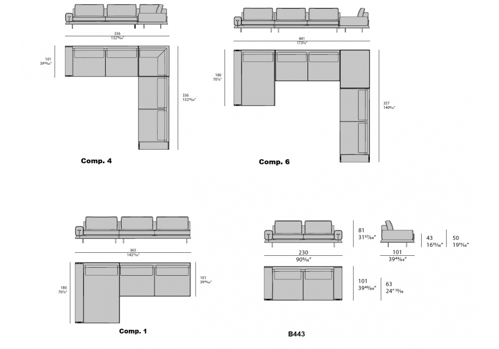 | Dimensions | Comp. 4_ 336 x 336 x H 81 cm; Comp. 6_ 441 x 357 x H 81 cm; Comp. 1_ 365 x 180 x H 81 cm; B443_ 230 x 101 x H 81 cm. |