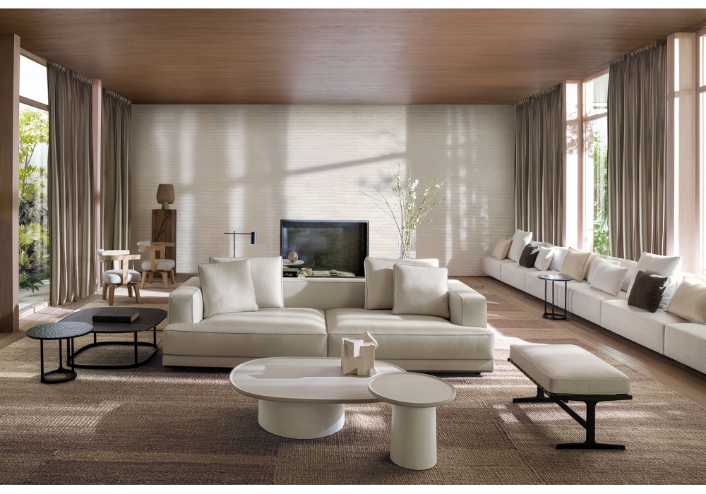 Augusto designed by Vincent Van Duysen for Molteni&C is a sofa made with painted aluminum base, fabric or leather upholstery and grosgrain inserts in polyester cotton tape. Structure padding in high capacity variable density polyurethane foam. Available in different finishes and dimensions.