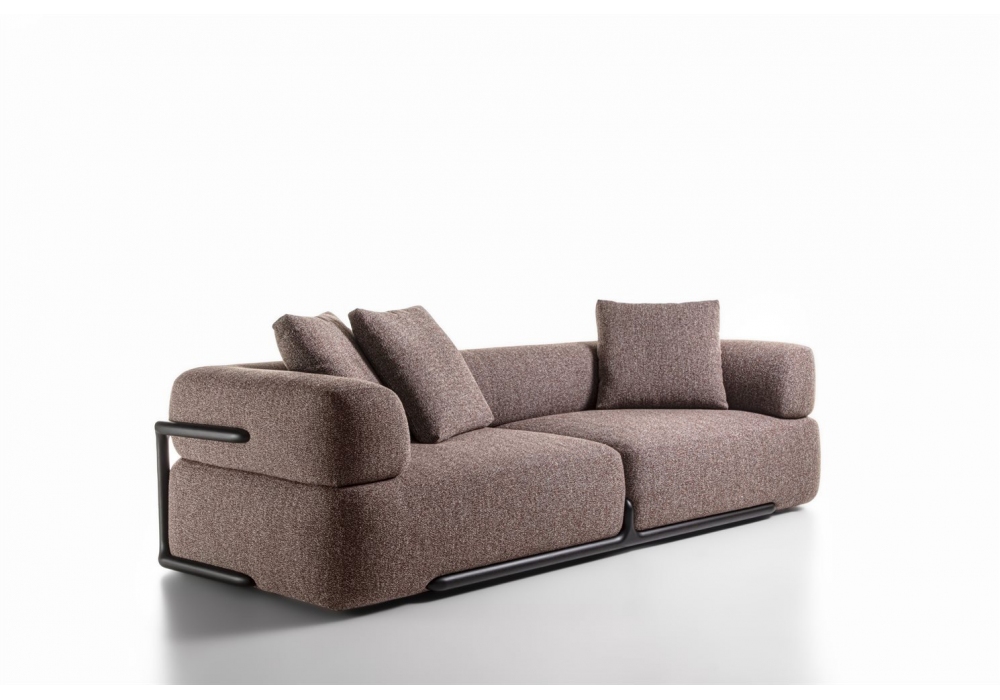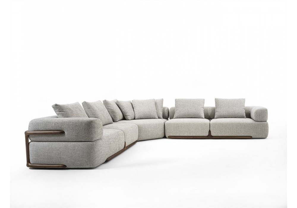 Klem designed by Giuseppe Viganò for Porada is a modular seating system with structure in solid canaletta walnut and upholstery in fabric or leather. Internal structure in plywood, solid fir or poplar and elastic straps. Padding in multi-density polyurethane foam and polyester fiber lining. Back cushions in sterilized feathers and polyurethane foam insert. Nylon tips.