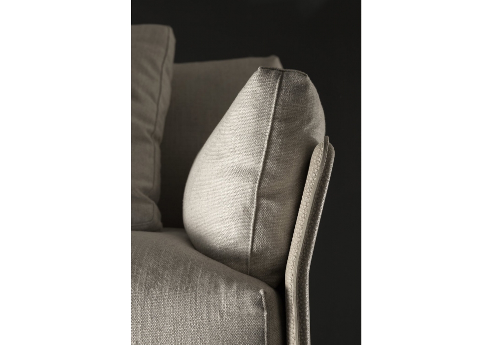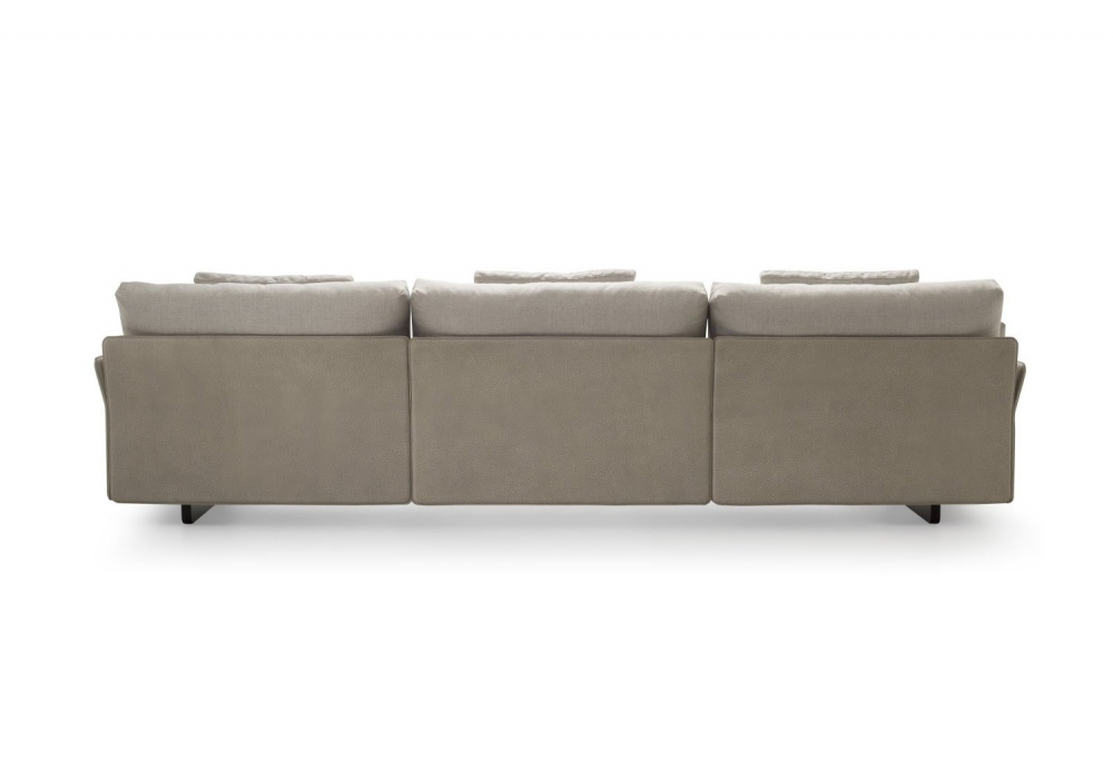 Murphy designed by Umberto Asnago for Bodema is a modular sofa with narrow armrests and slim backrests in leather or fabric, goose down cushions and high feet in black MDF. Customizable for upholstery and dimensions, it can be configured in linear, corner models, with chaise longue or end pouf.