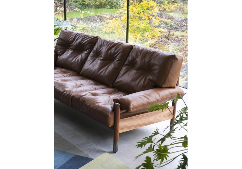 Sella designed by Carlo De Carli for Tacchini is a sofa with structure in canaletto walnut with leather belts. Feather cushion padding for the seat, feather cushions with rubber insert for the backrest to give support. Metal details in shiny black chrome finish. Upholstery in fabric or leather (not removable).