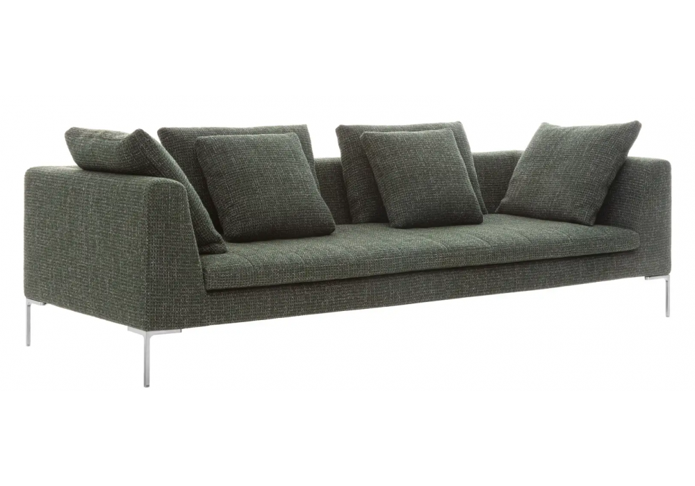 Charles Carré designed by Antonio Citterio for B&B Italia is a sofa with a supporting structure in tubular and steel profiles with aluminum feet with tips in thermoplastic material. The internal frame padding is covered in Bayfit® flexible cold-formed polyurethane foam and polyester fiber lining. The padding of the seat cushions is in shaped polyurethane of differentiated density, sterilized down and polyester fiber lining. The backrest padding is in polyester fibre. The upholstery is in leather or fabric available in different finishes.