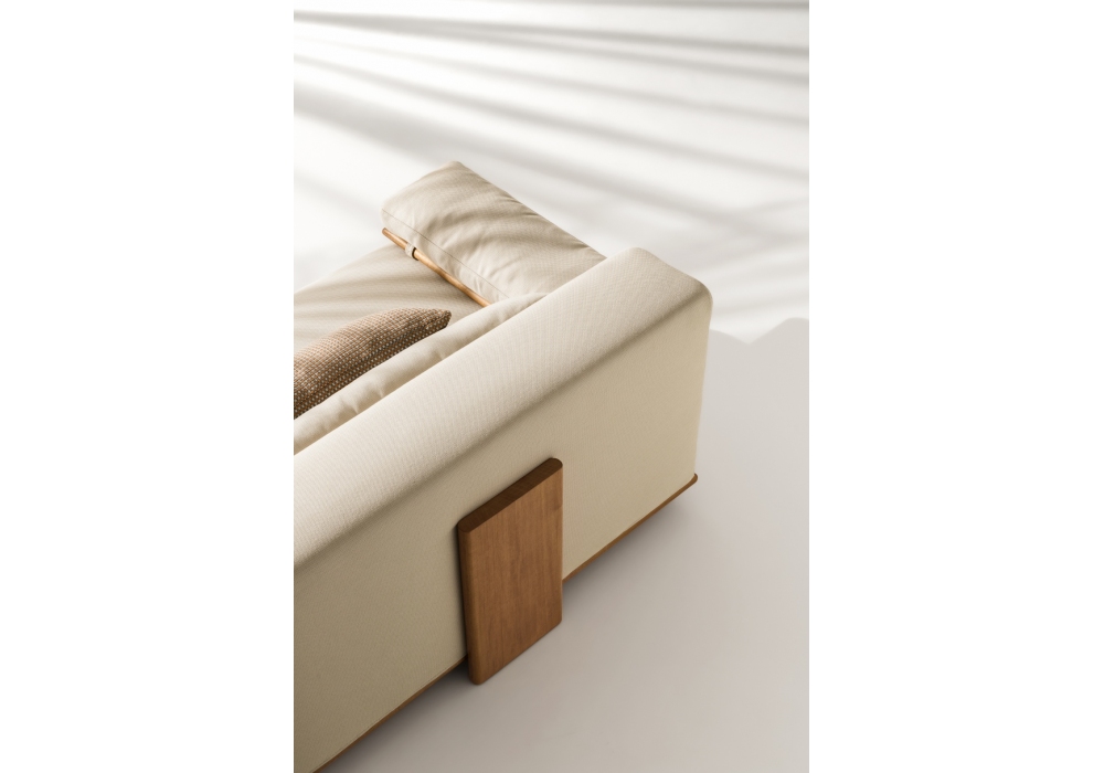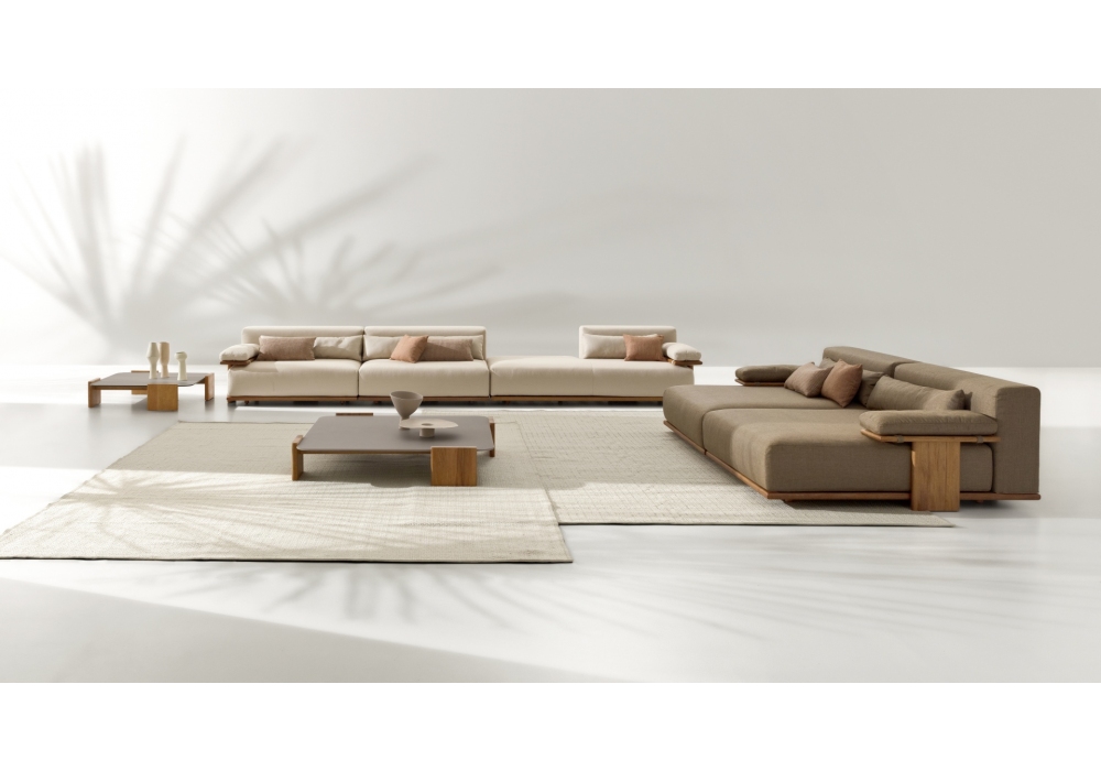 Tao Outdoor designed by Ramon Esteve Estudio for Ditre Italia is an outdoor sofa with base, armrest and optional backrest in solid Iroko wood. Frame in solid wood, pre-lining in breathable water-repellent material. Upholstery in fabric or leather. Available in different sizes and customizable configurations.