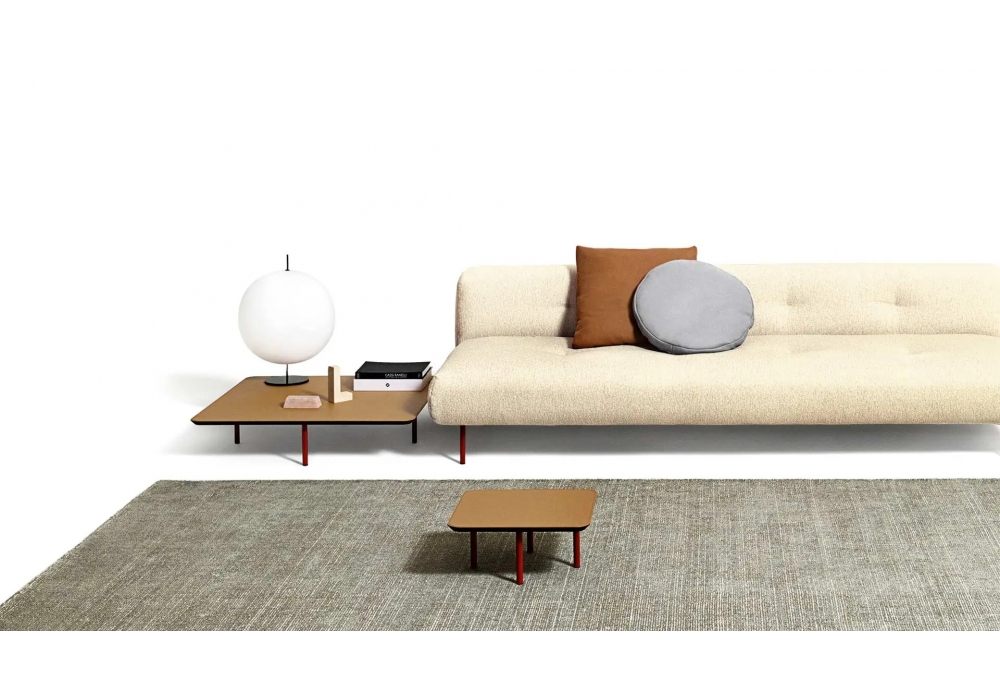 Erei designed by Elisa Ossino for DePadova is a modular sofa with a wooden supporting structure with elastic straps. The feet are in powder-coated steel in gunmetal or brick color with an adjustable insole in thermoplastic material. The padding is in polyurethane foam with different densities, memory foam and polyester wadding lined with polyester velvet with removable fabric or fixed leather upholstery. Headrest cushions in polyurethane foam and polyester wadding, lined with polyester velvet. Armrest pocket in leather with non-slip rear support. Erei is available in different compositions and finishes.