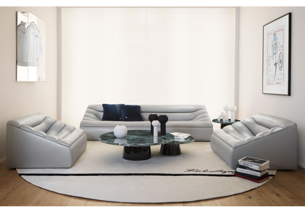 Wellen, designed by Toan Nguyen for Karl Lagerfeld Maison, is a sofa with wooden internal frame and non-removable upholstery available in different fabrics.