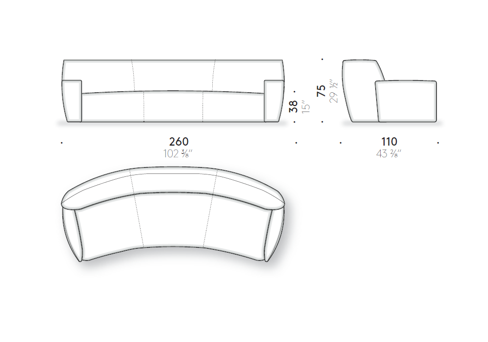 Ami designed by Yabu Pushelberg for DePadova is a curved sofa with a birch plywood and polimex structure, equipped with elastic straps for optimal comfort. The padding is in differentiated density polyurethane foam and polyester wadding, covered in velvet. Feet in thermoplastic material. Upholstery available in a technically removable version in fabric or fixed in leather or velvet.