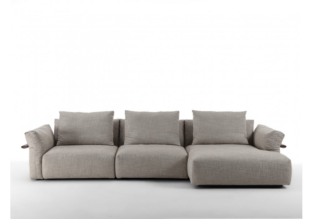 Ronny designed by G. & O. Buratti for Porada is a modular sofa with pewter grey metal base and canaletta walnut structure. Removable fabric upholstery and non-removable leather upholstery.