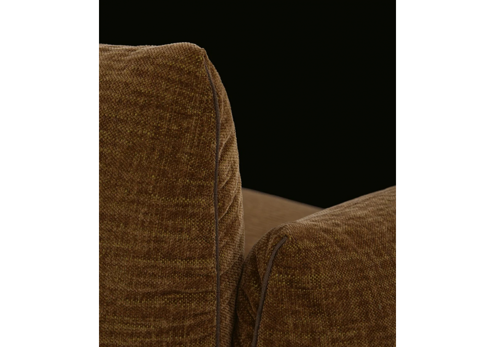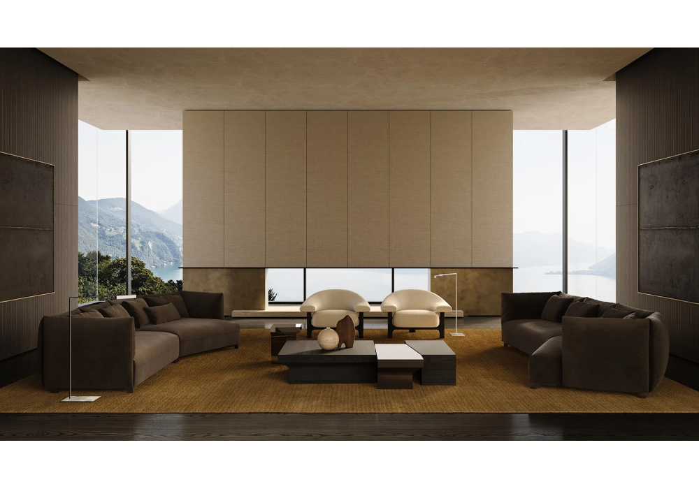 Joan designed by Jean Marie Massaud for Poliform is a sofa with a wooden frame and polyurethane foam of different densities, pre-covered in cotton canvas and polyester fiber. Backrests in flexible molded polyurethane, with optional coordinated cushions. Feet in matt brown nickel painted aluminum. Removable fabric or leather upholstery; in the fabric version, finished with a grosgrain border in sample colors.