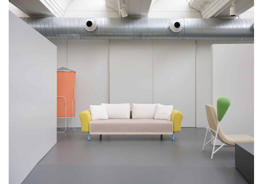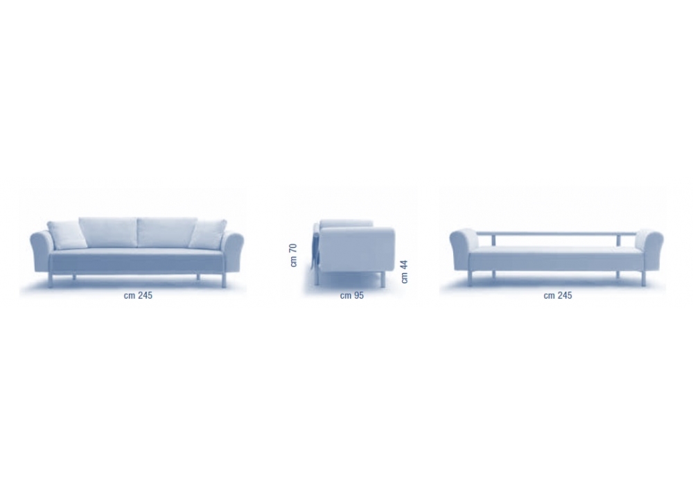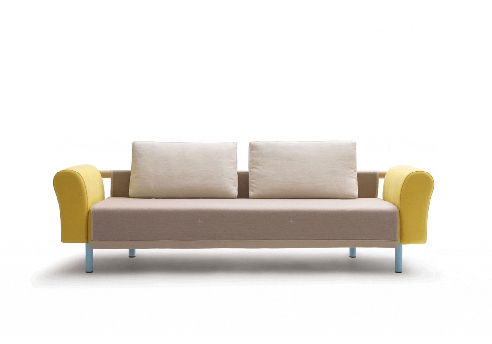 Commedia designed by Campeggi is a daybed with a supporting structure in liquid painted iron, polyurethane seat padding and fabric upholstery. Backrest bar with circular section in natural beech painted transparent.