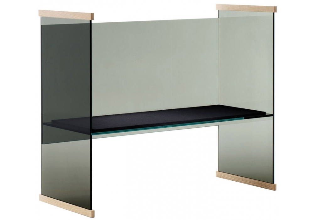 Diapositive designed by Ronan & Erwan Bouroullec for Glas Italia is a sofa in extralight laminated and heat-sealed glass, with elements in solid natural ash or dark oak fixed to the ends of the supporting sides. Available in different finishes.