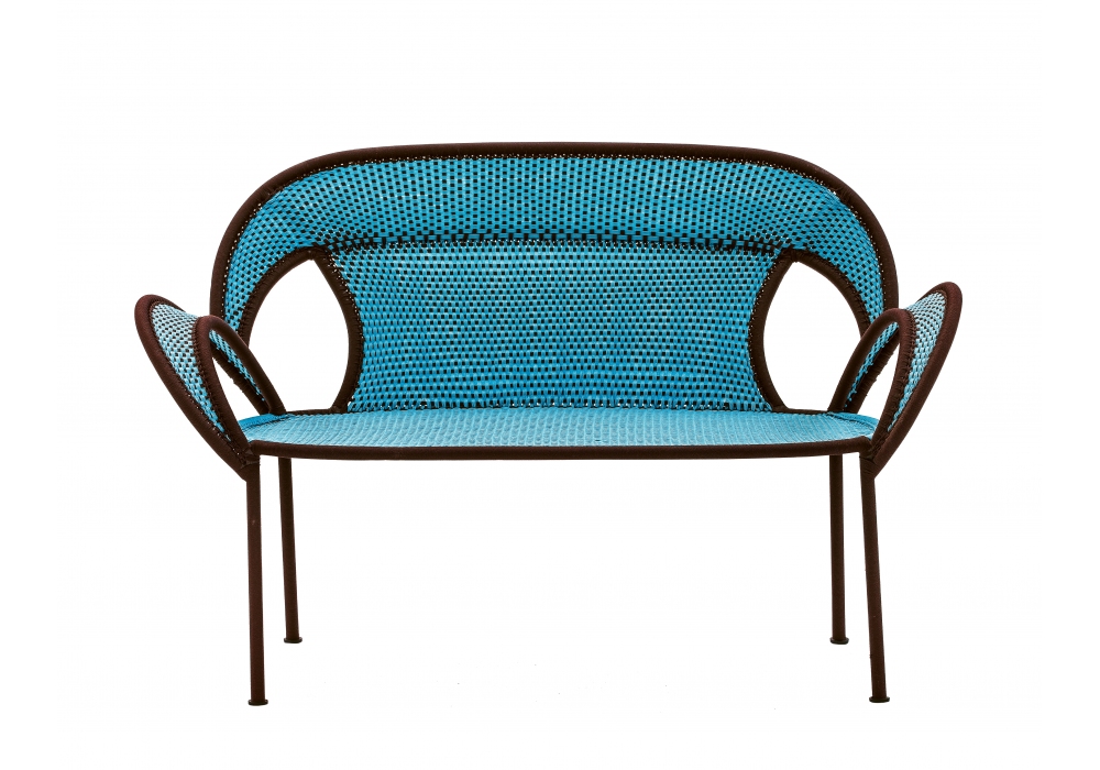 Banjooli designed by Sebastian Herkner for Moroso is a small sofa with painted steel structure and colored hand-woven polyethylene threads. PVC insoles.